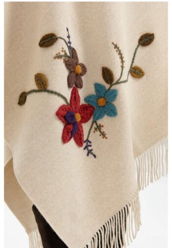 Desen Triko Kadın Kapüşonlu Omuzu Çiçek İşlemeli Panço-24064