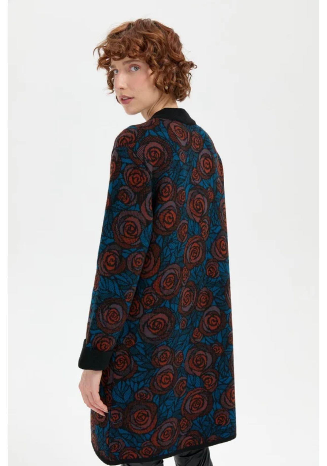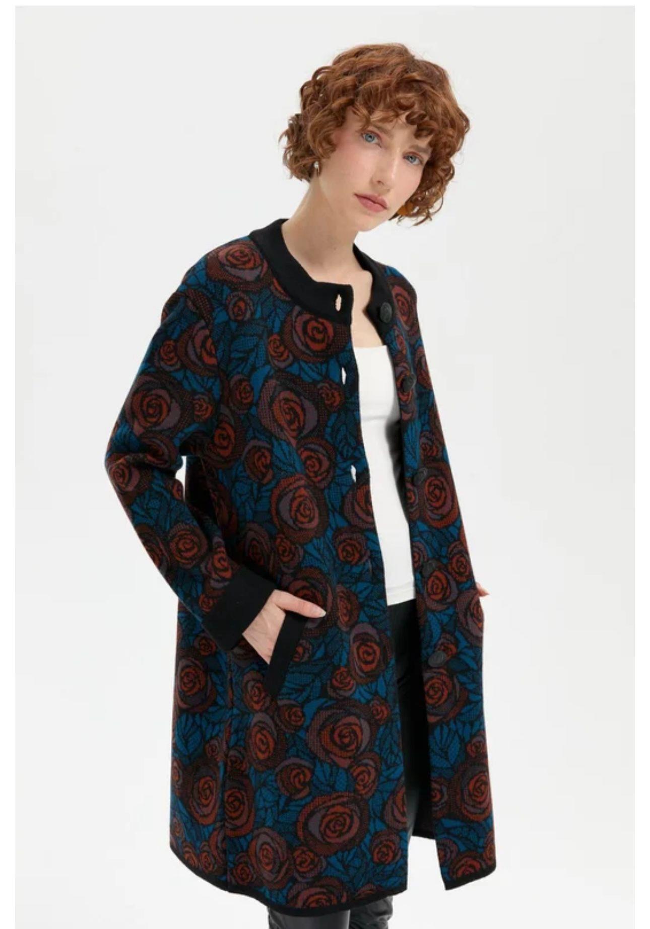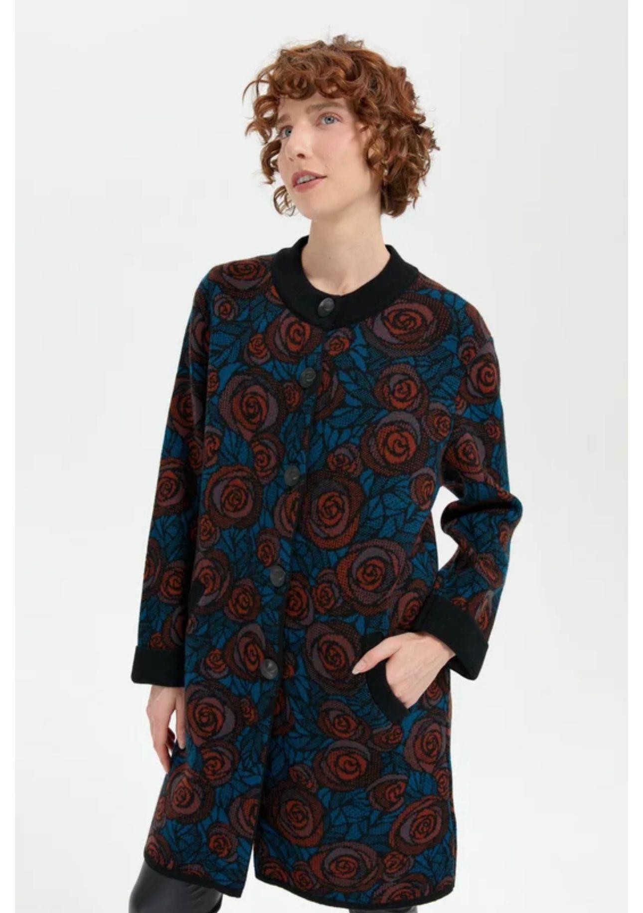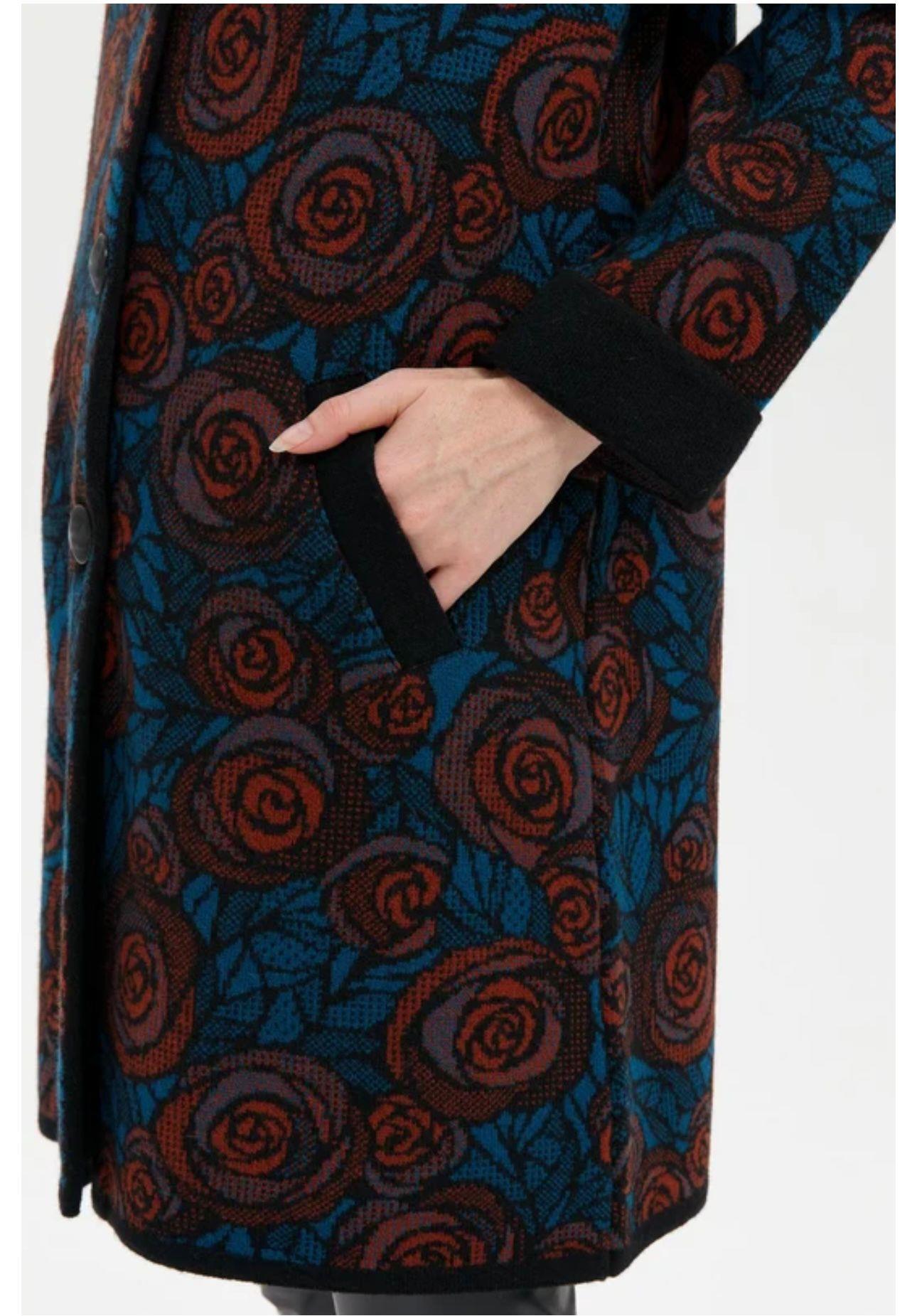 Desen Triko Kadın Dik Yaka Gül Desenli Uzun Yün Kaban-24048