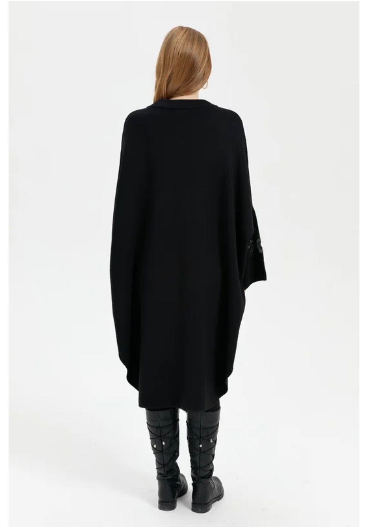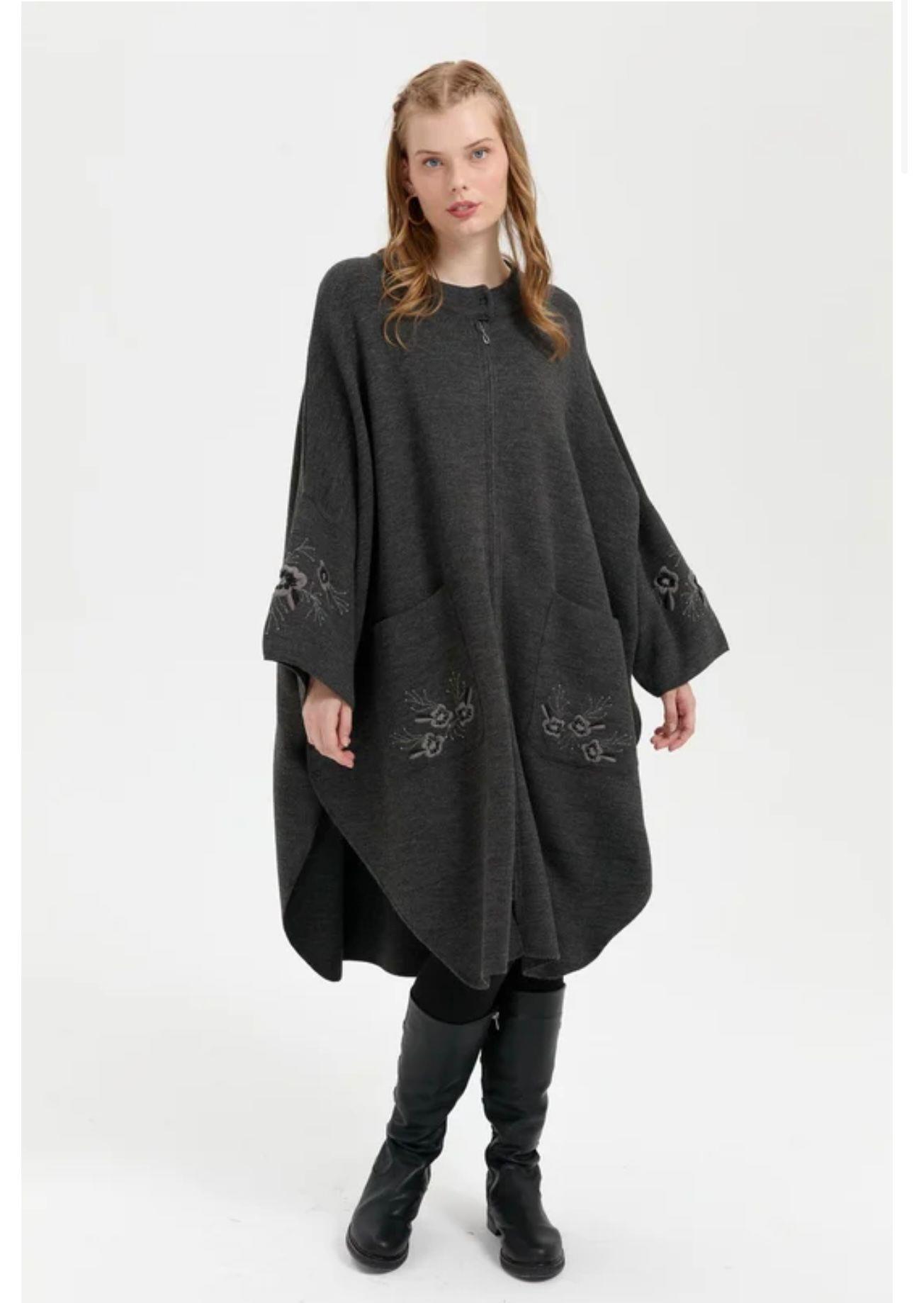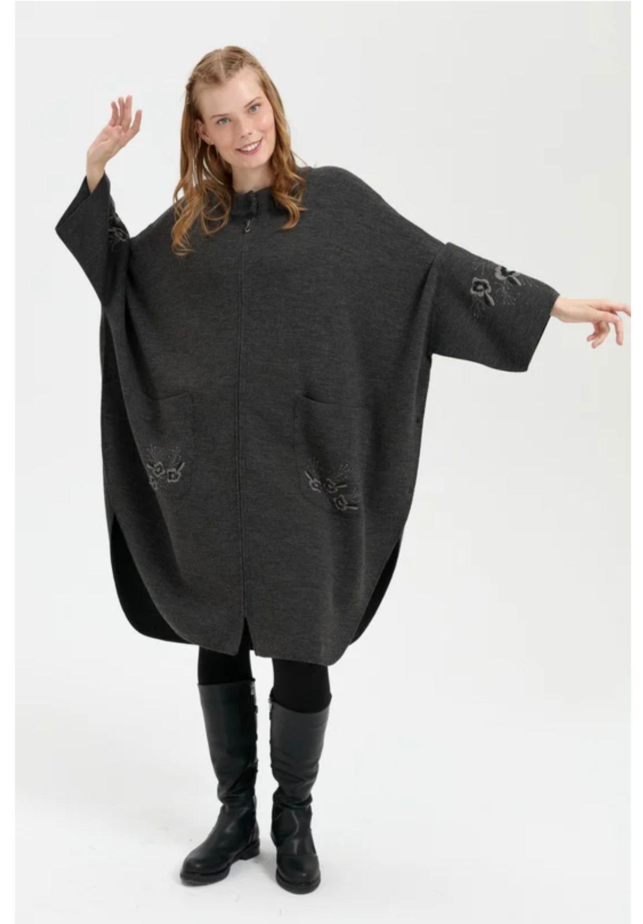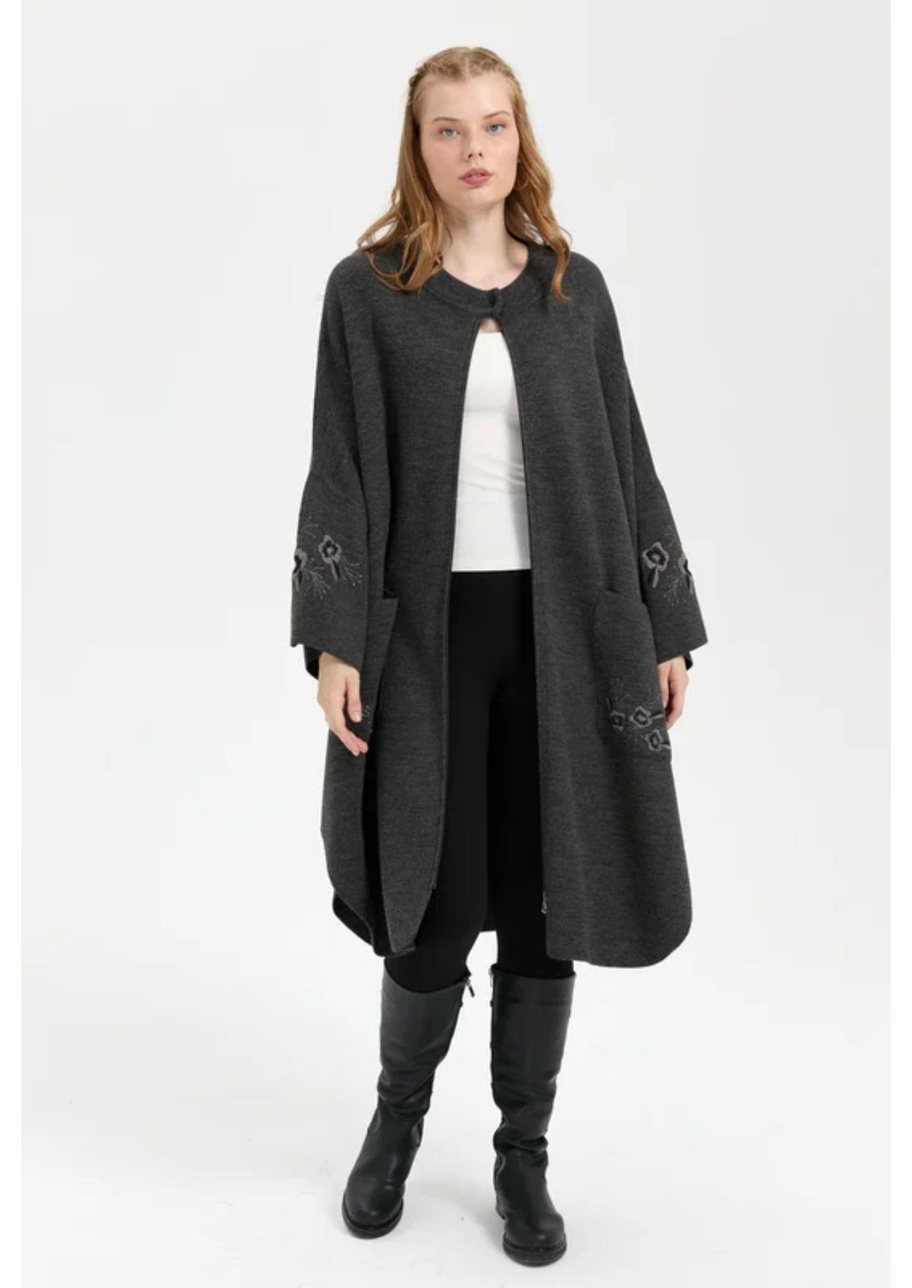 Desen Triko Kadın Dik Yaka Kolu ve Cebi İşlemeli Panço-24057