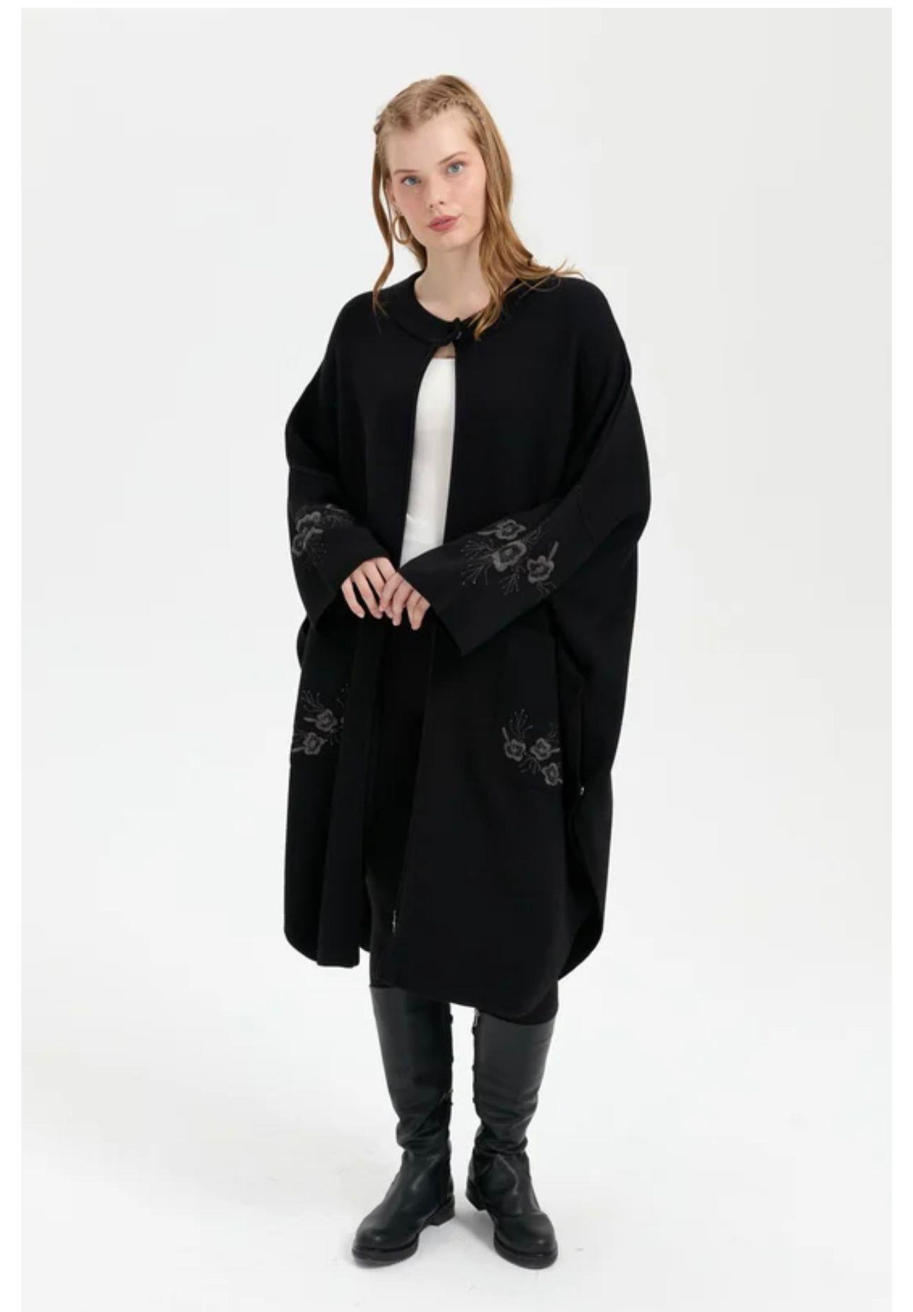 - Desen Triko Kadın Kapüşonlu Omuzu Çiçek İşlemeli Panço-24064
