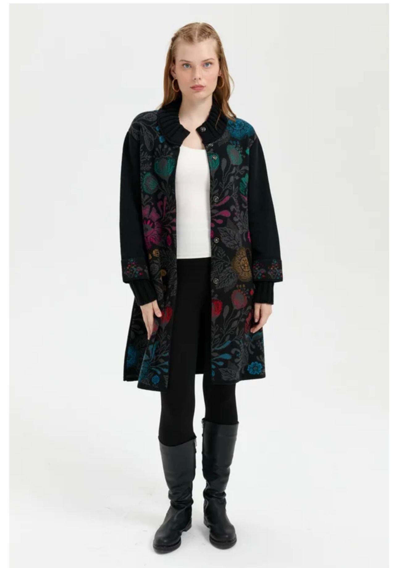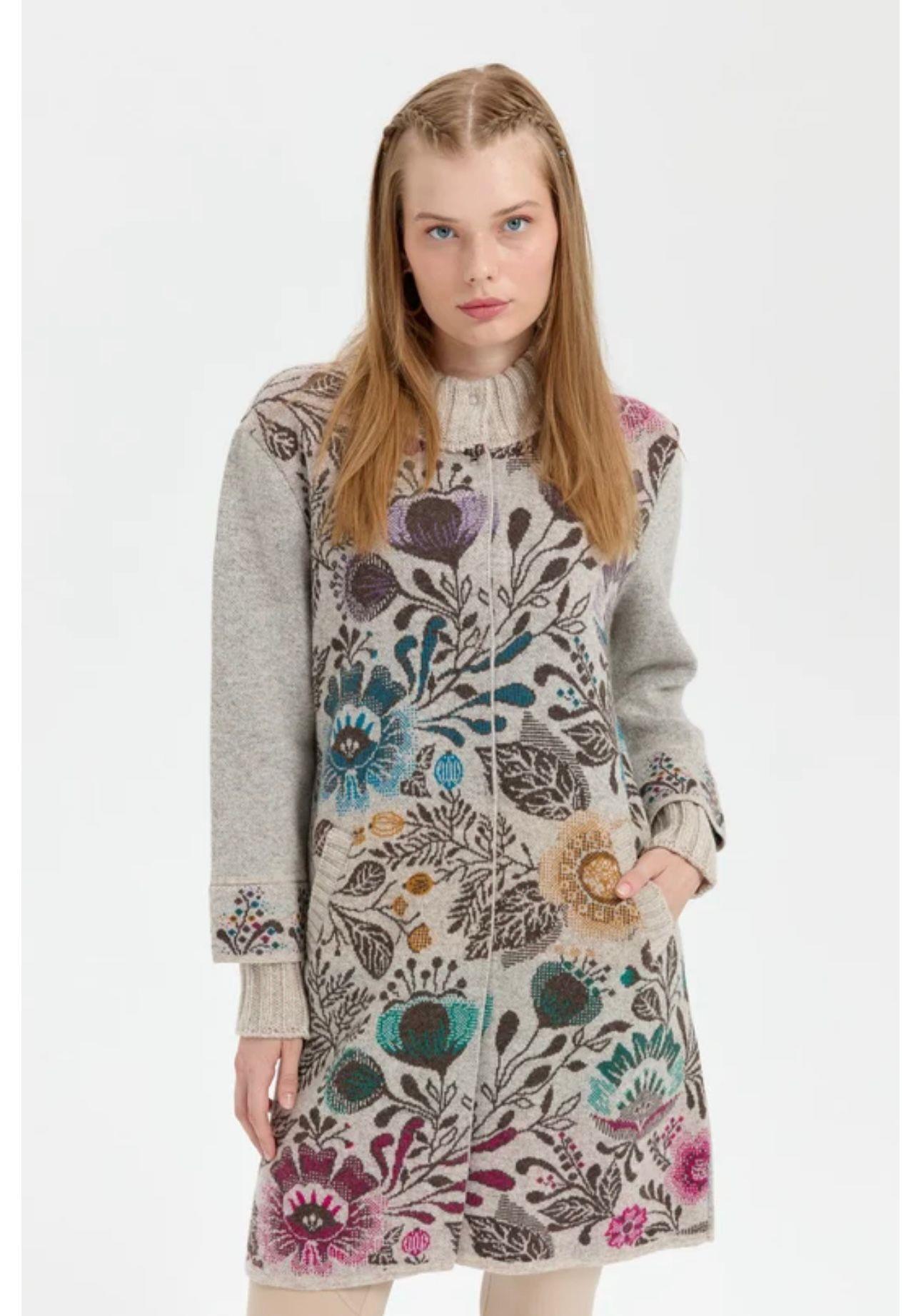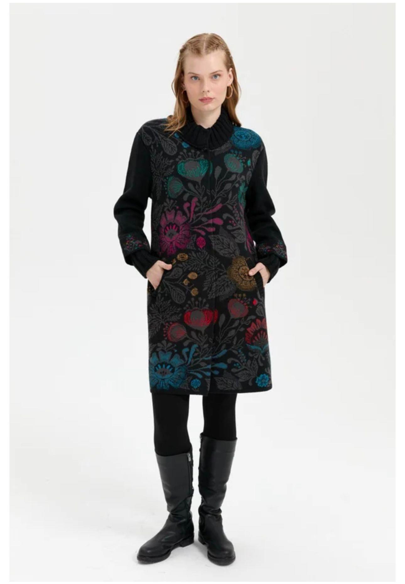 Desen Triko Kadın Dik Yaka Önü Renkli Çiçekli Uzun Yün Kaban-24051