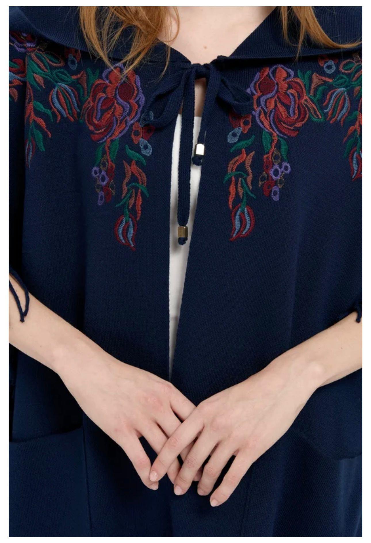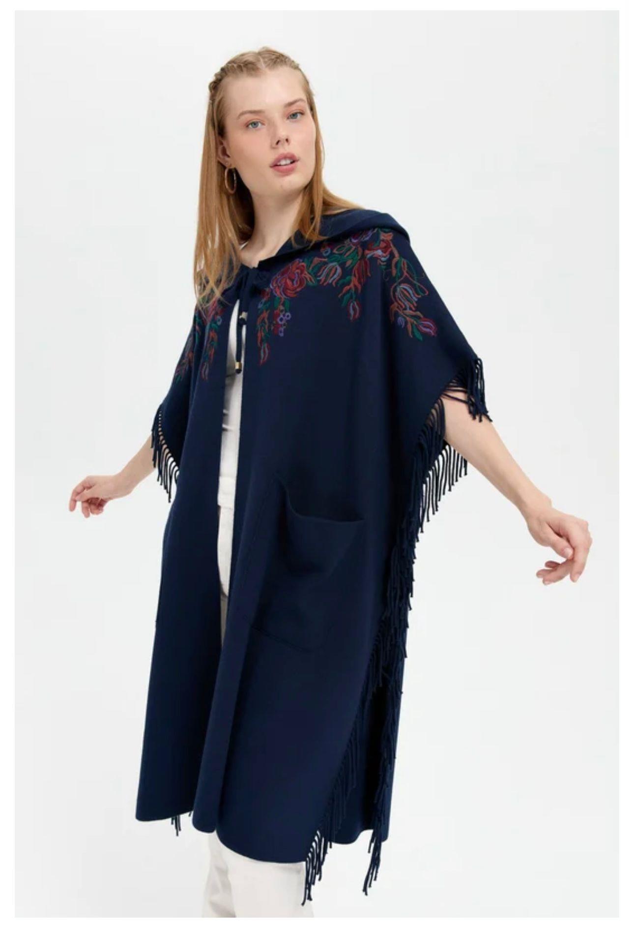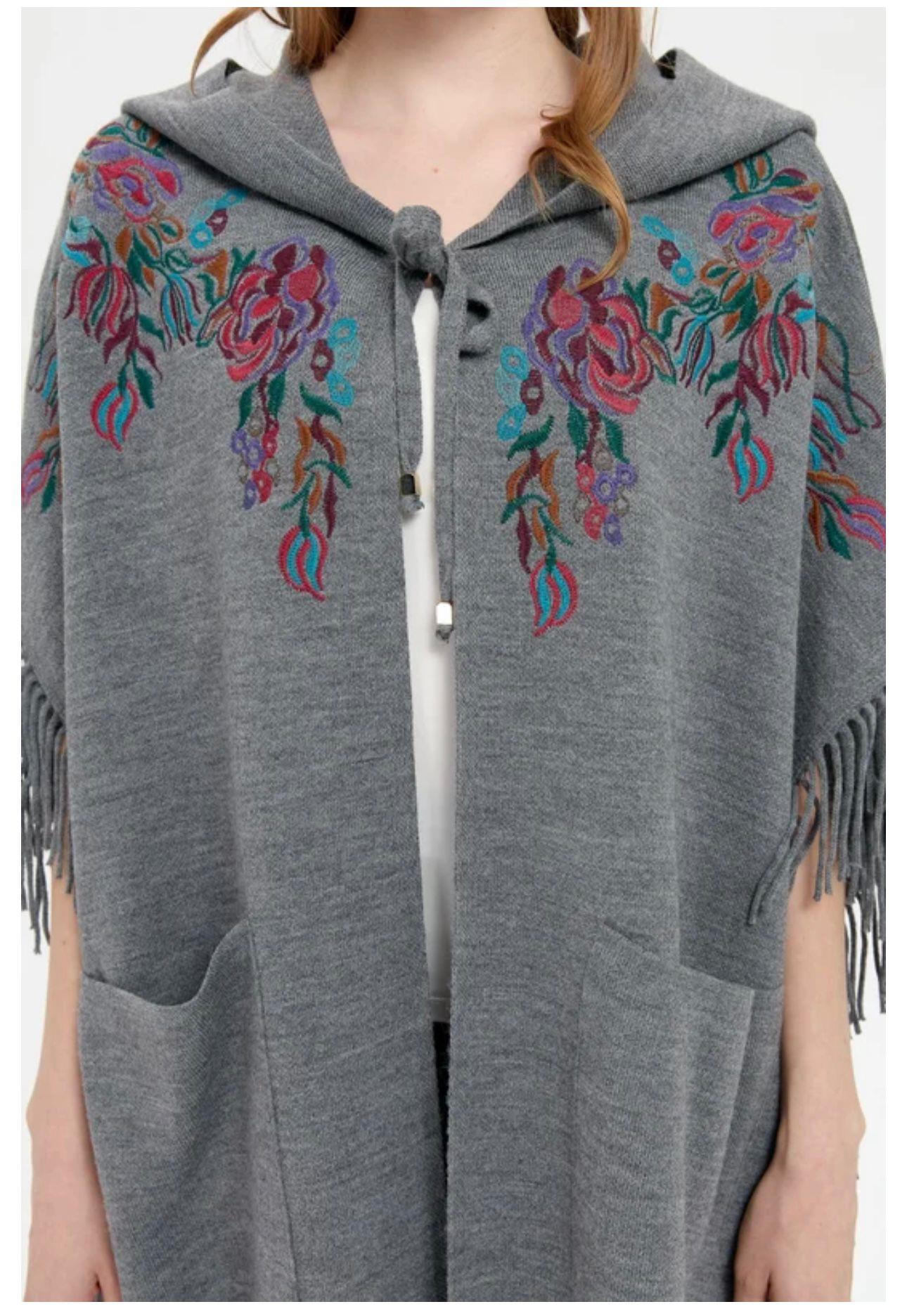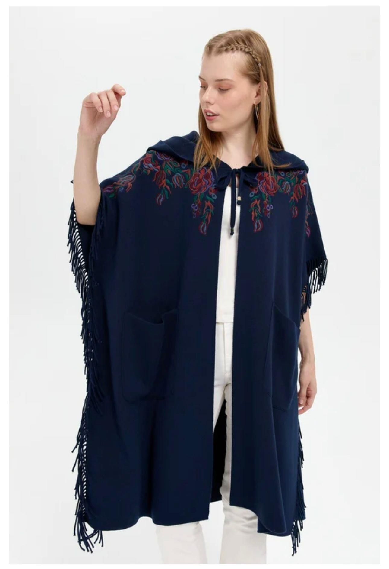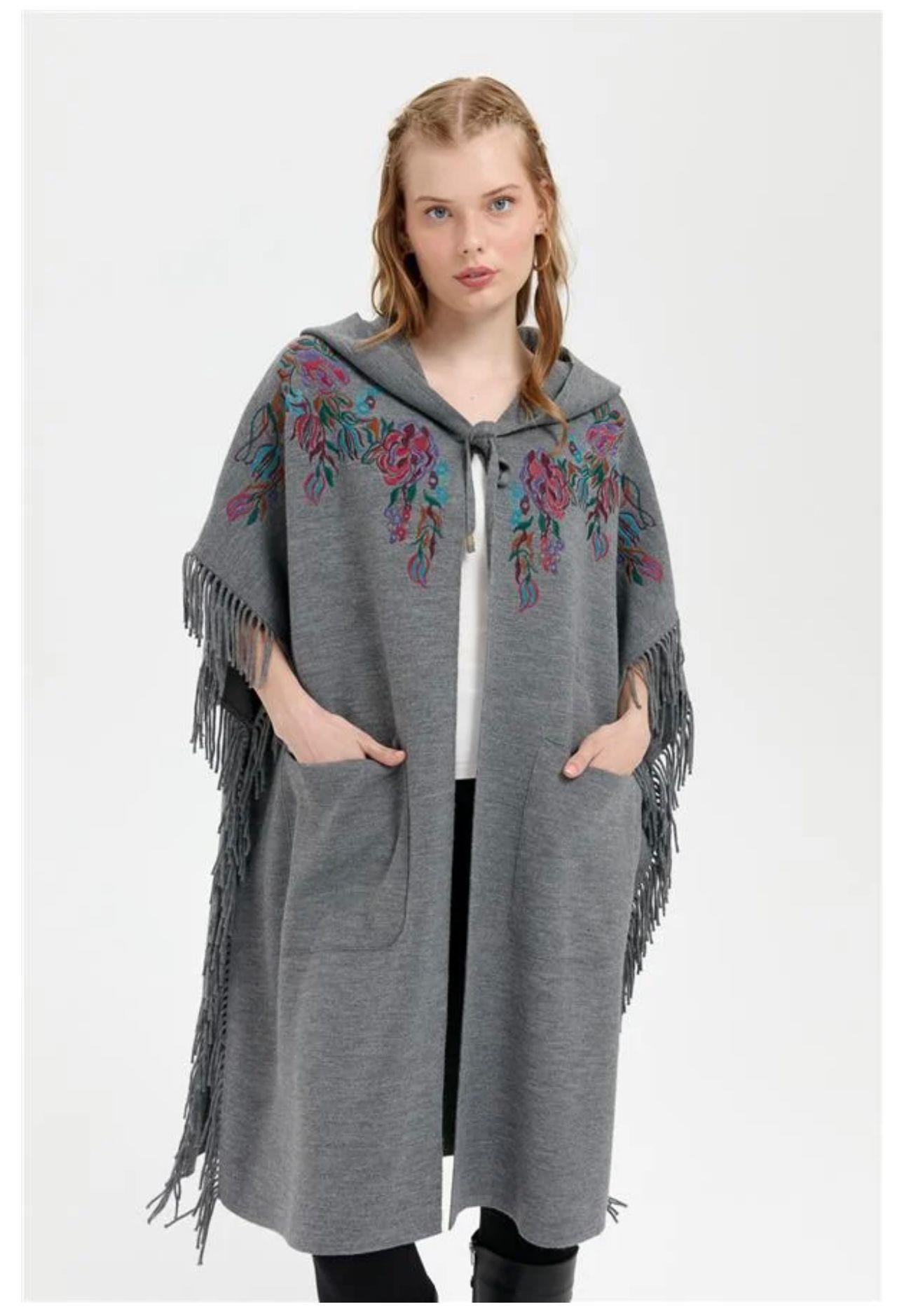 - Desen Triko Kadın Kapüşonlu Omuzu Çiçek İşlemeli Panço-24064