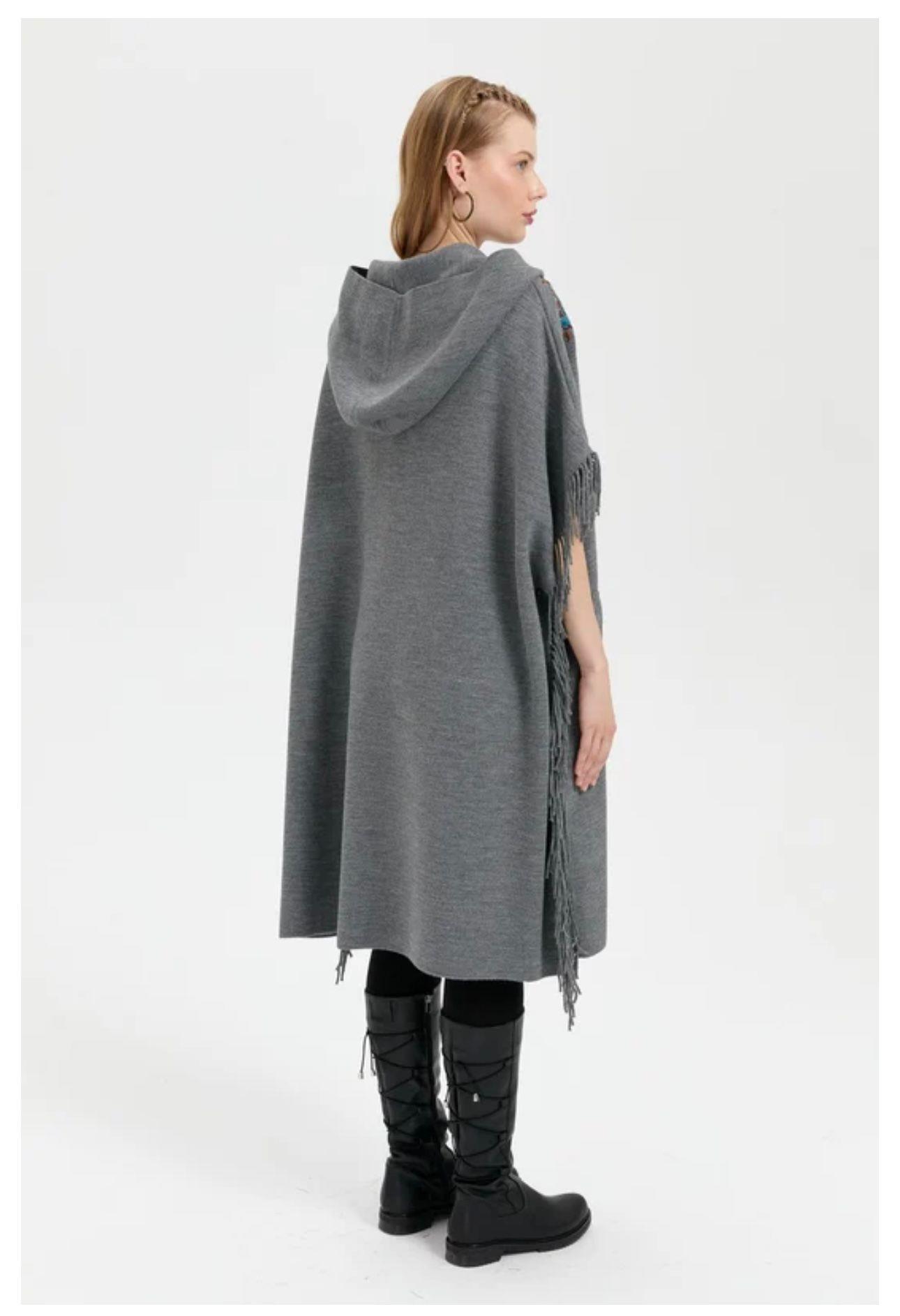 Desen Triko Kadın Kapüşonlu Nakış İşlemeli Yanı Püsküllü Panço-24061