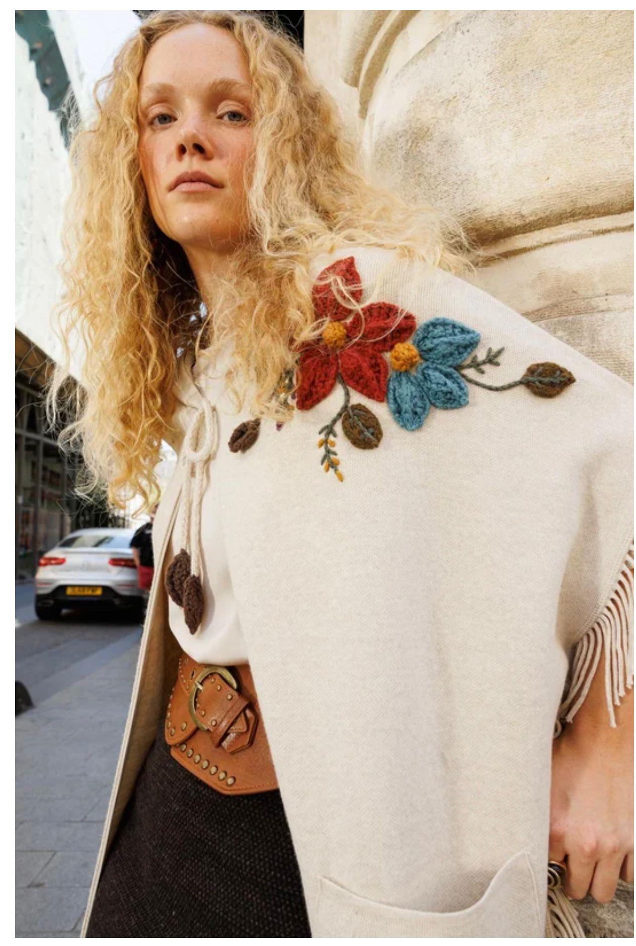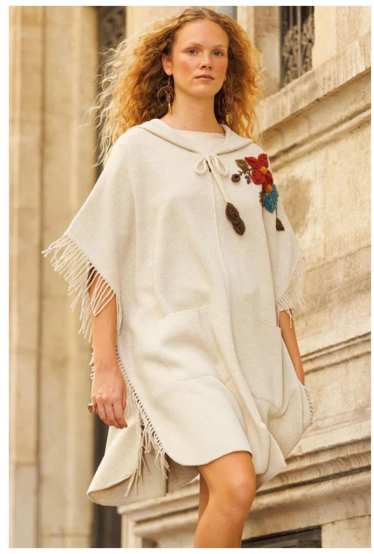 - Desen Triko Kadın Kapüşonlu Omuzu Çiçek İşlemeli Panço-24064
