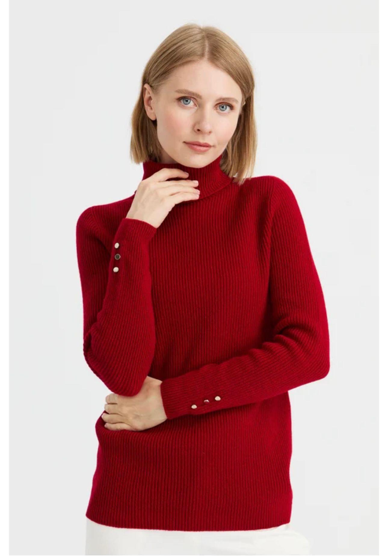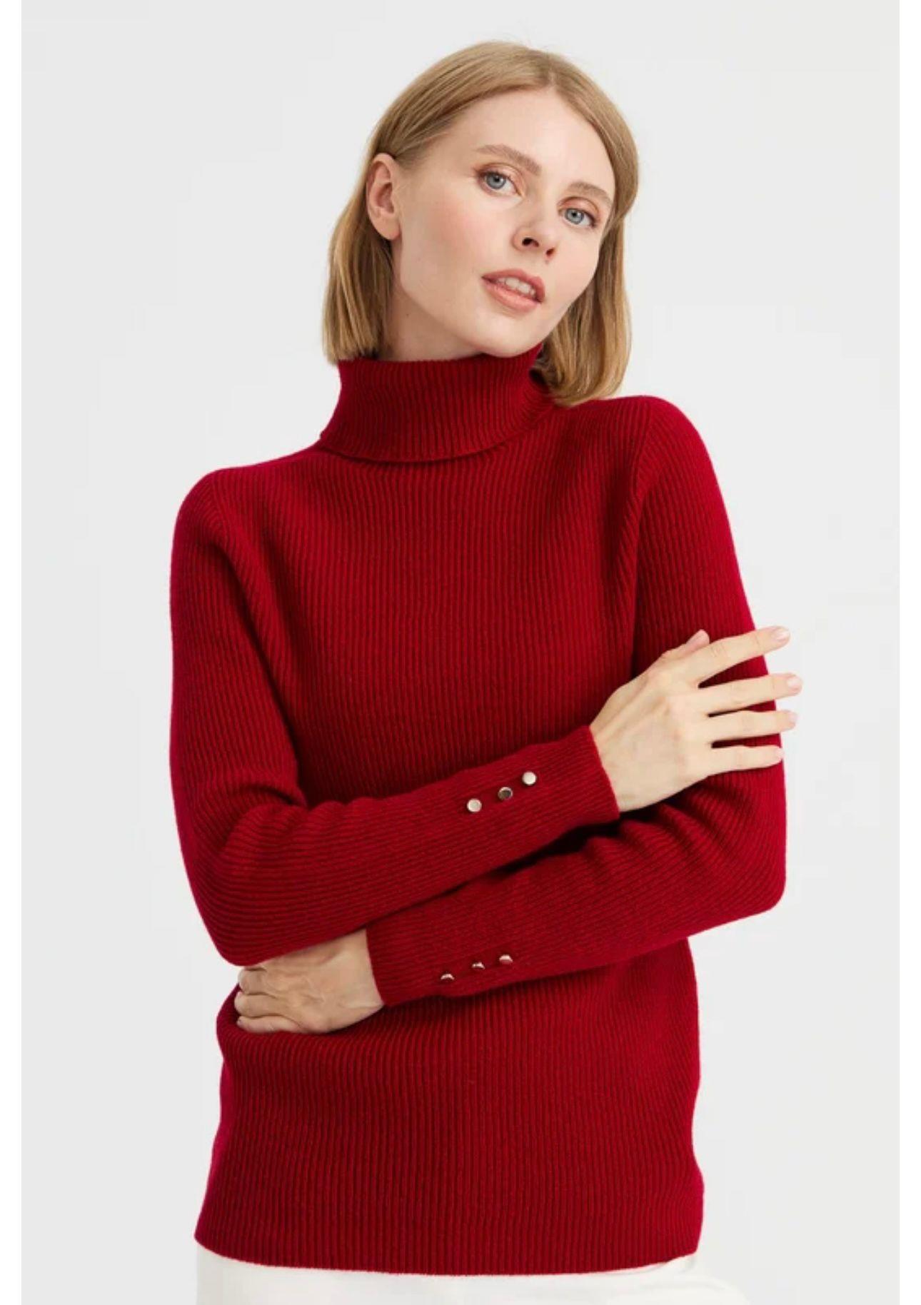 - Desen Triko Kadın Sıfır Yaka Kol Ucu Düğmeli Yün Kazak-23158