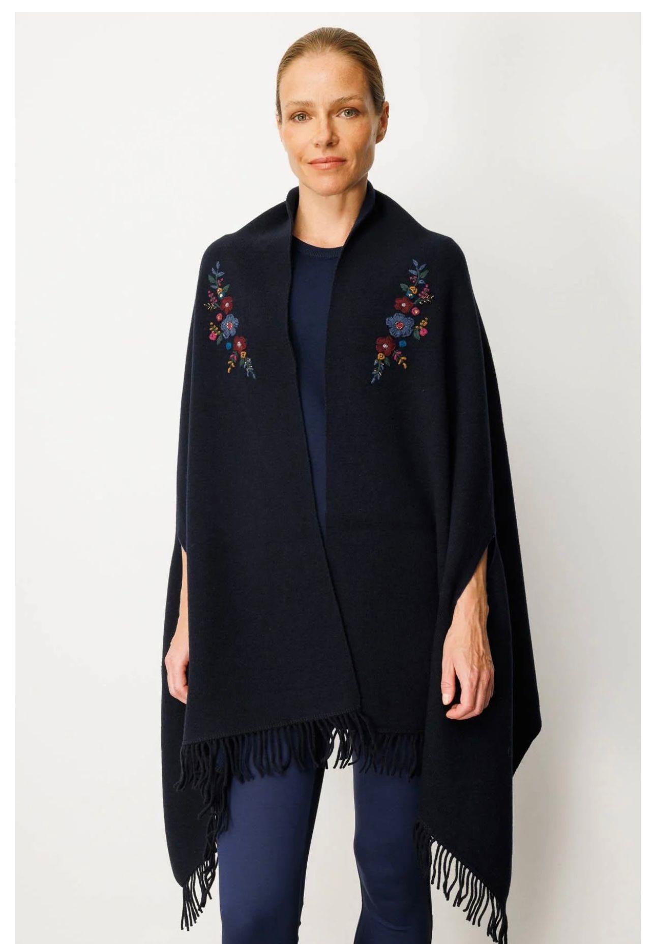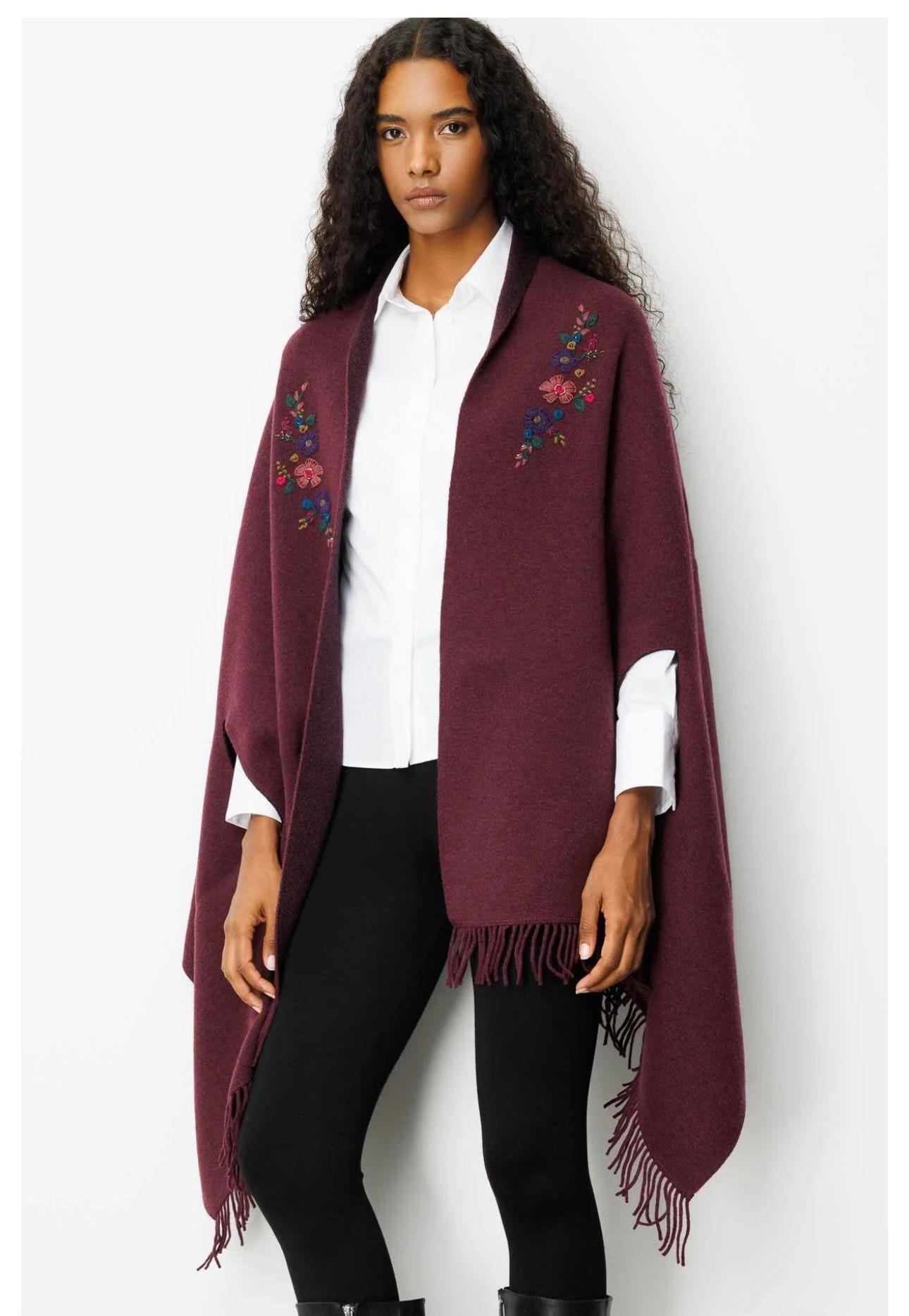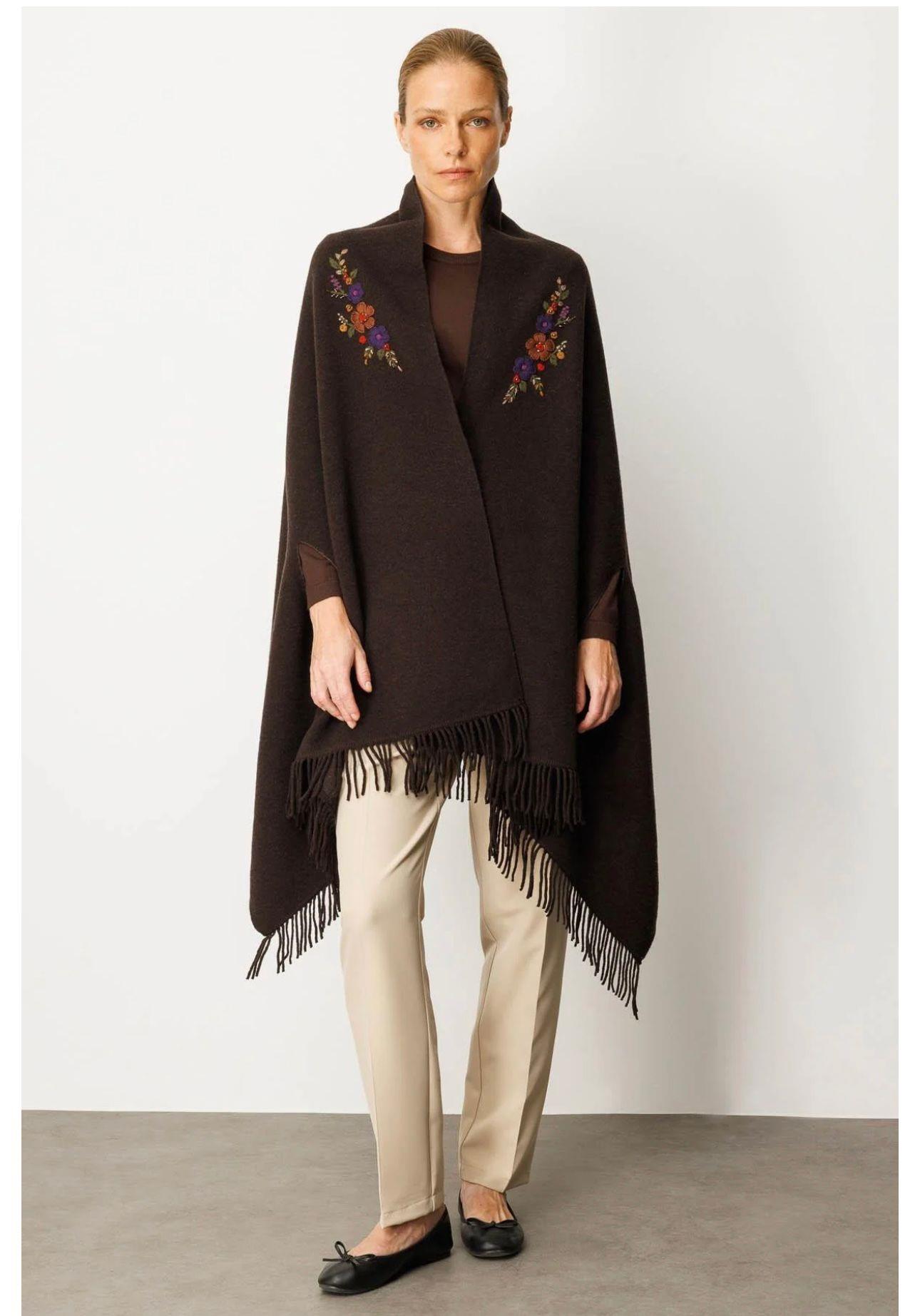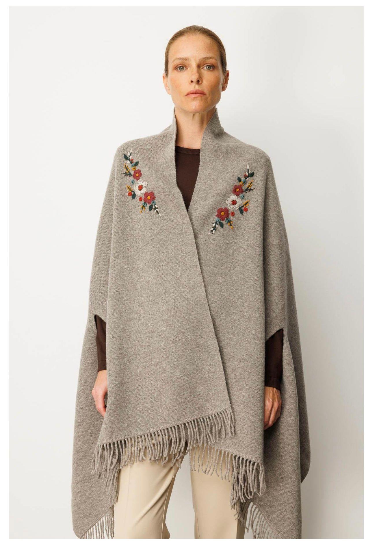 - Desen Triko Kadın Kapüşonlu Omuzu Çiçek İşlemeli Panço-24064