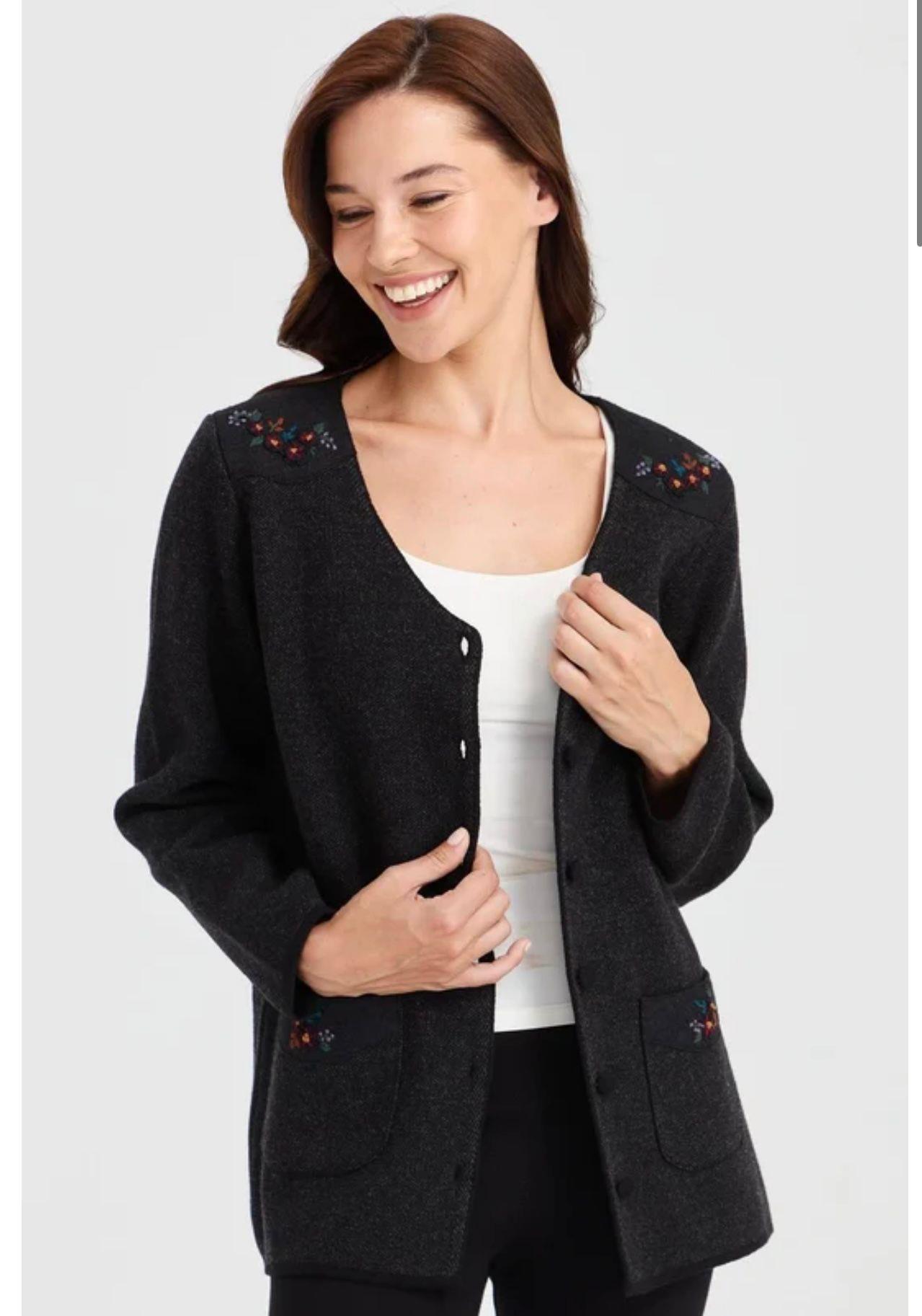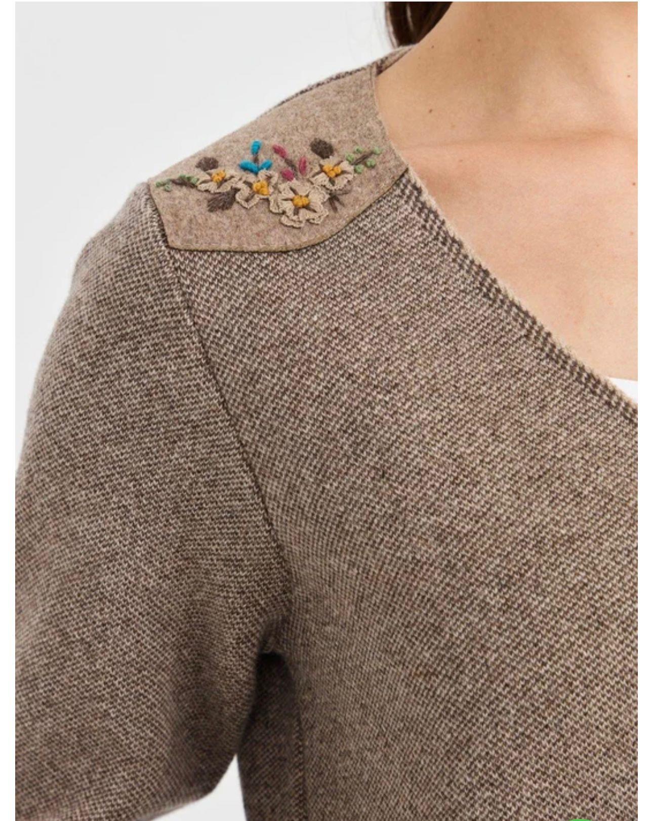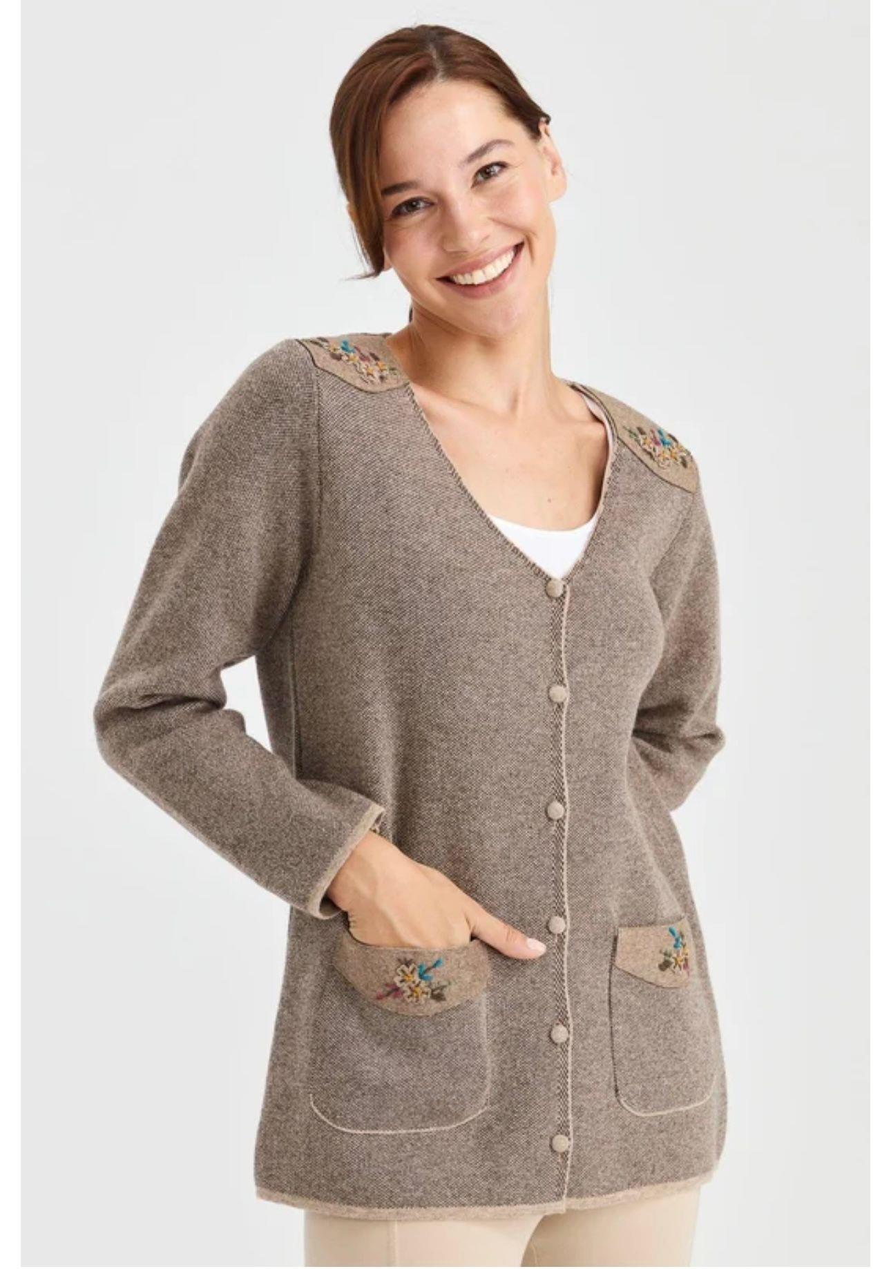 Desen Triko Omzu ve Cebi Çiçek Detaylı Yün Hırka-23009