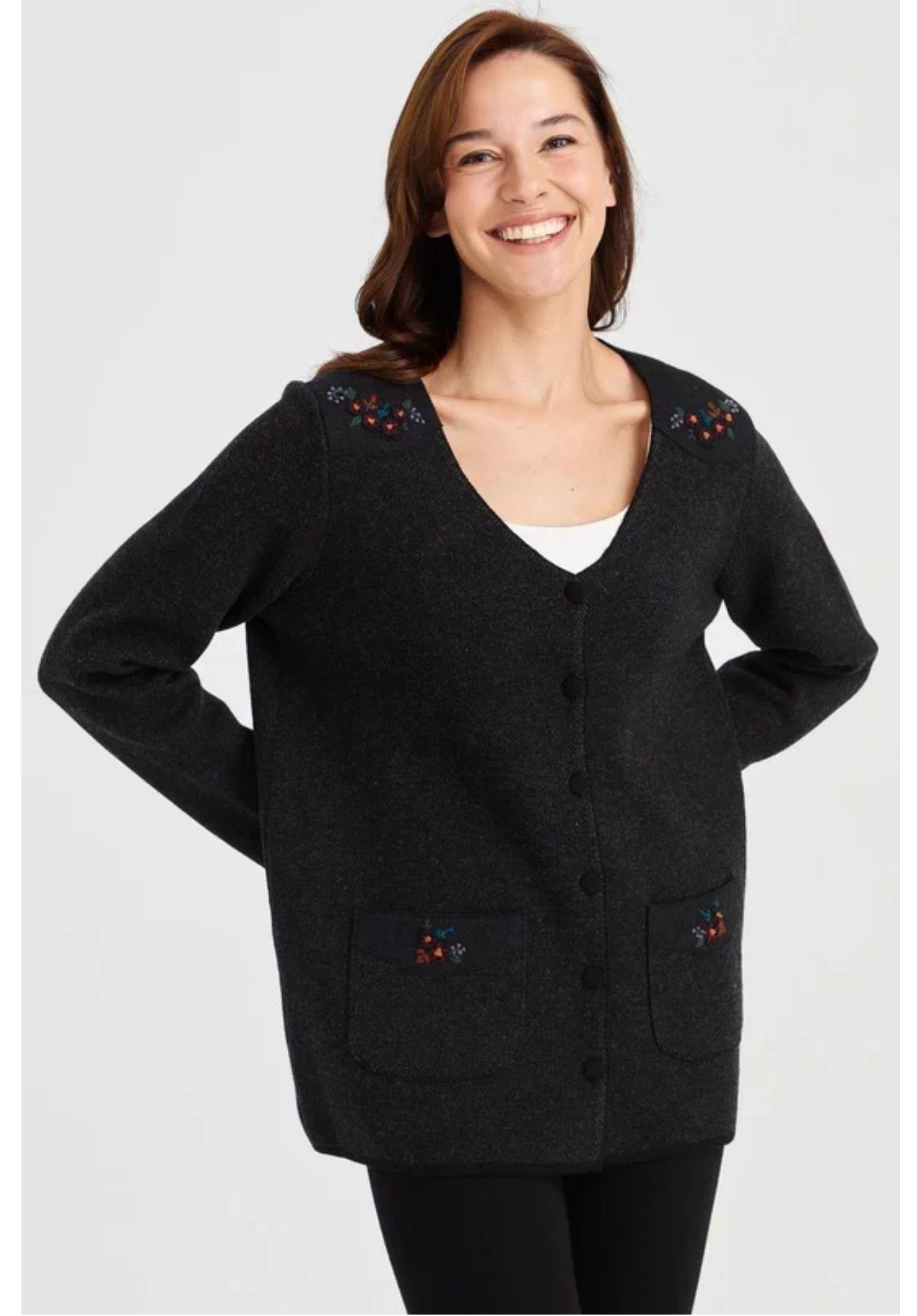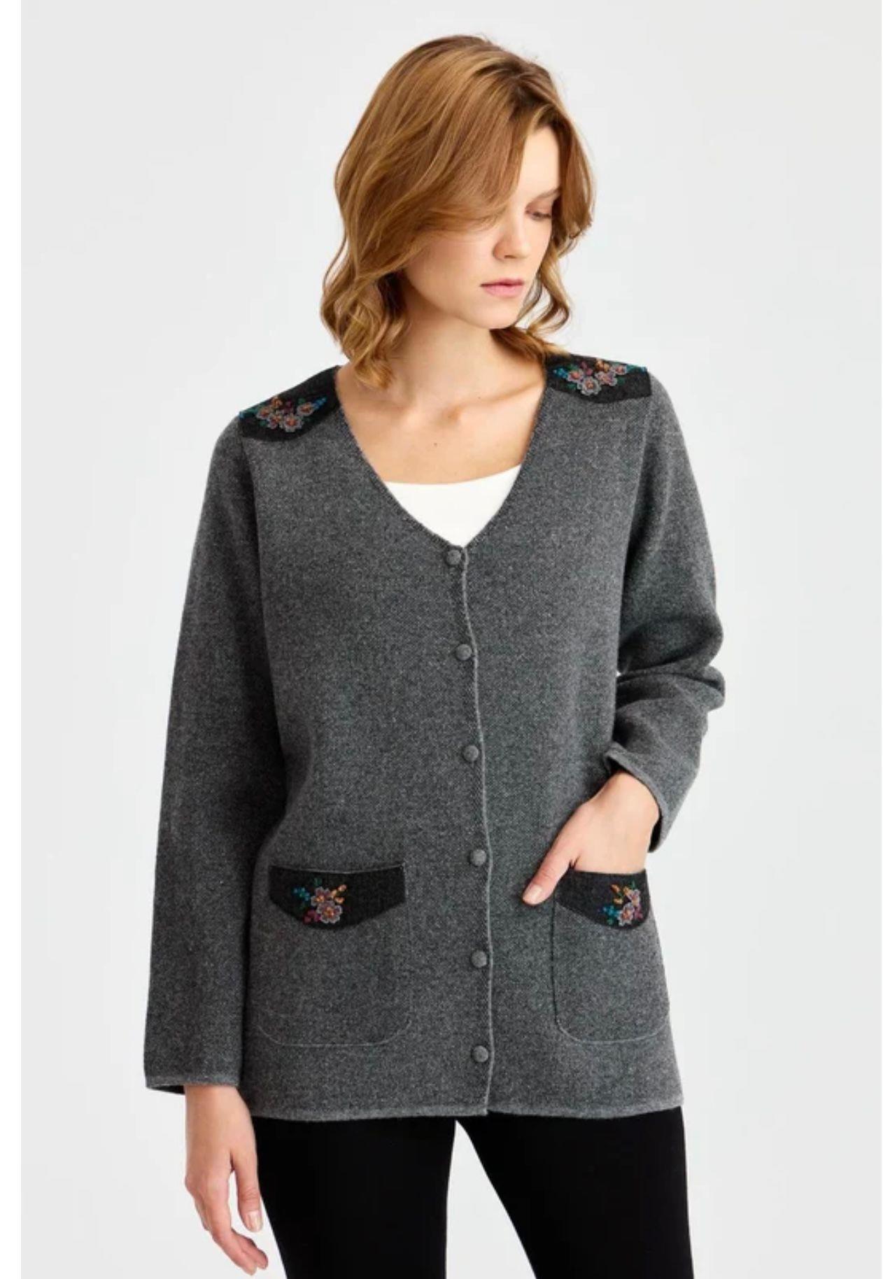 - Desen Triko Omzu ve Cebi Çiçek Detaylı Yün Hırka-23009