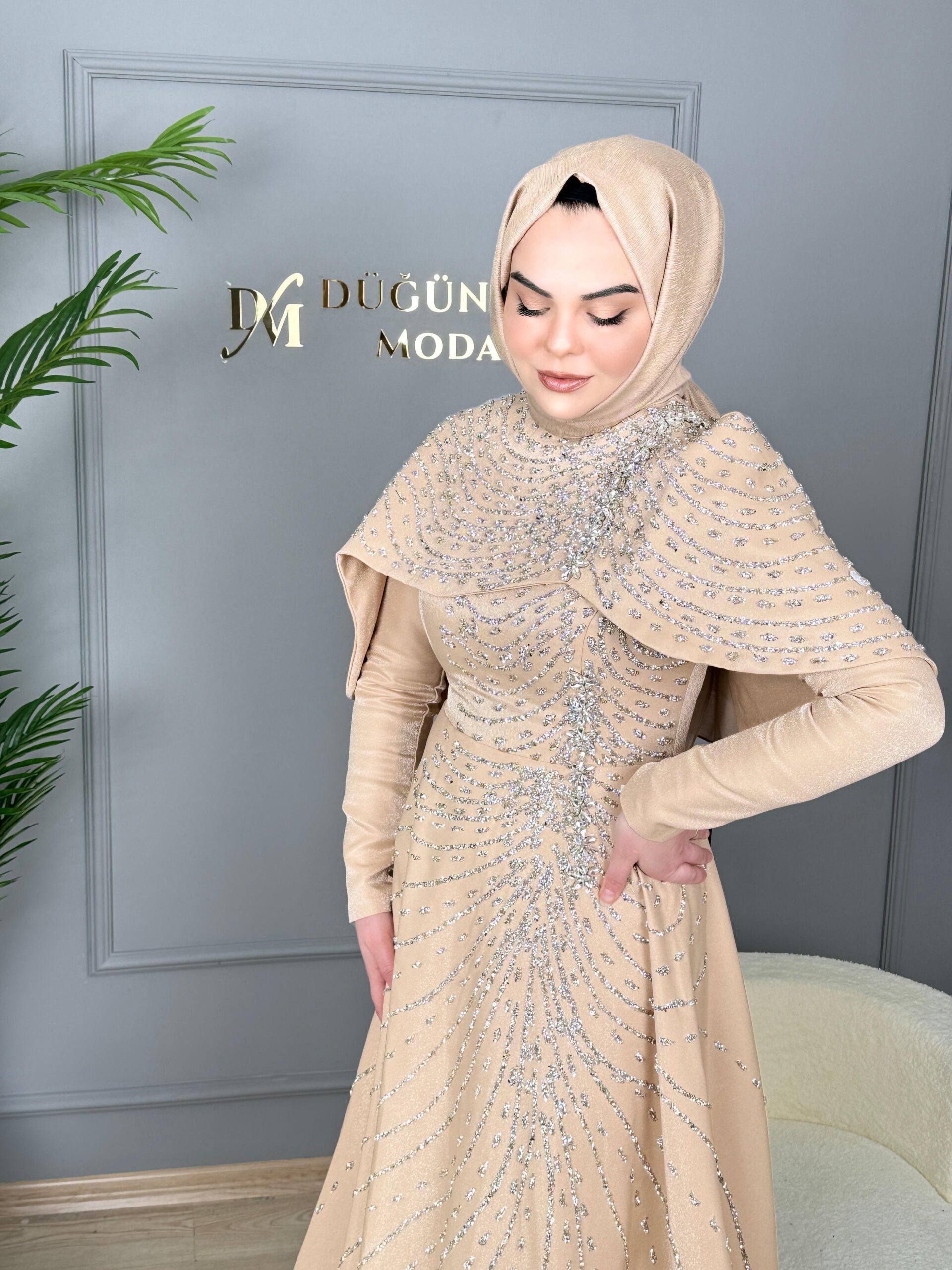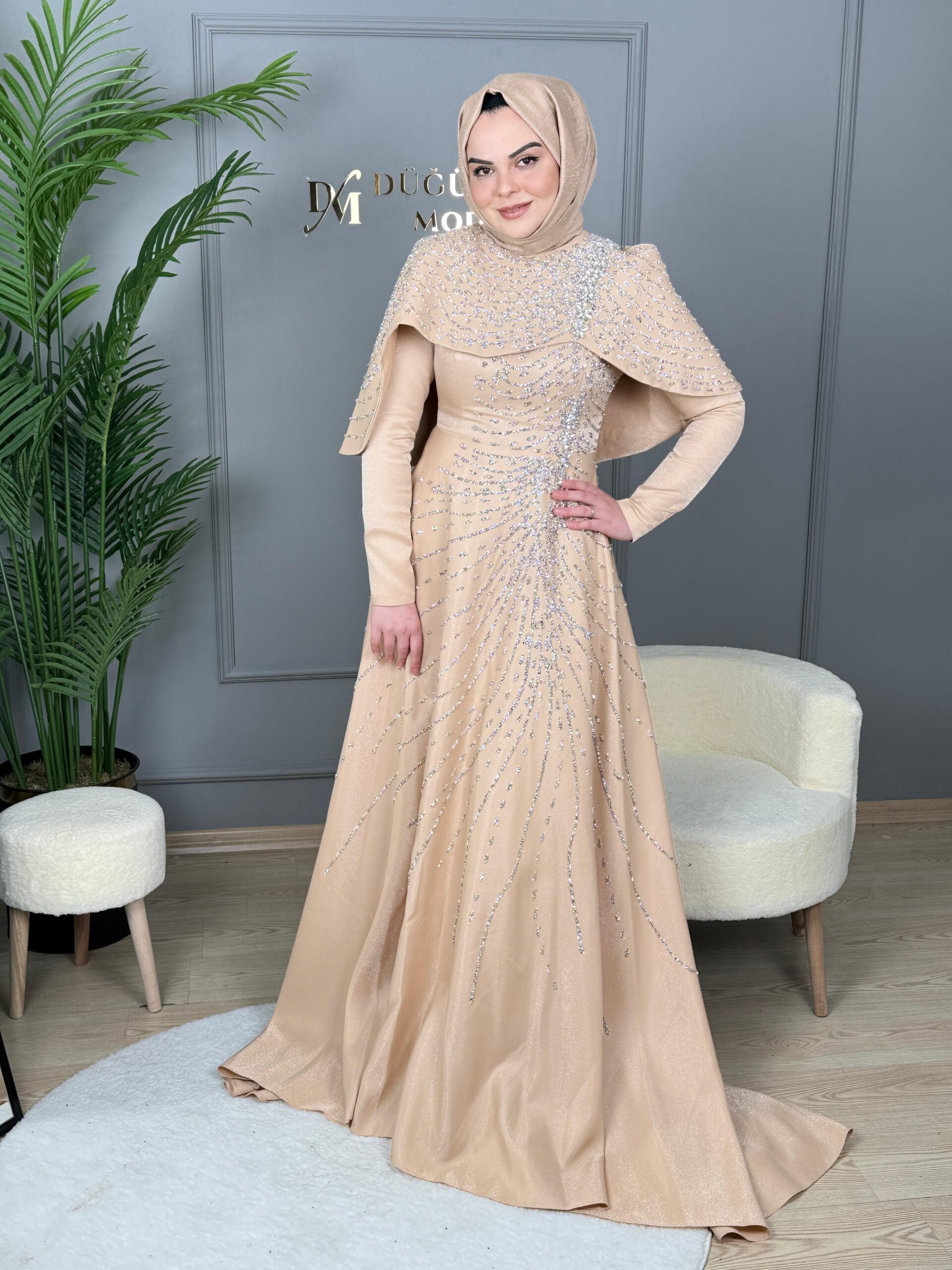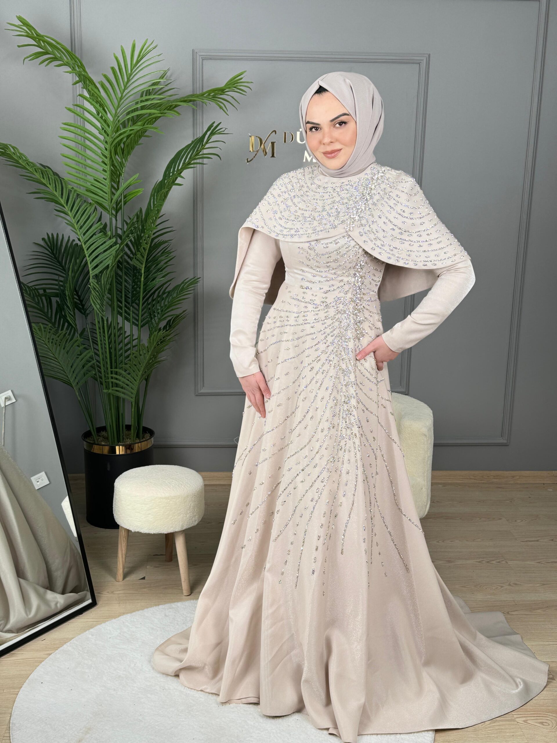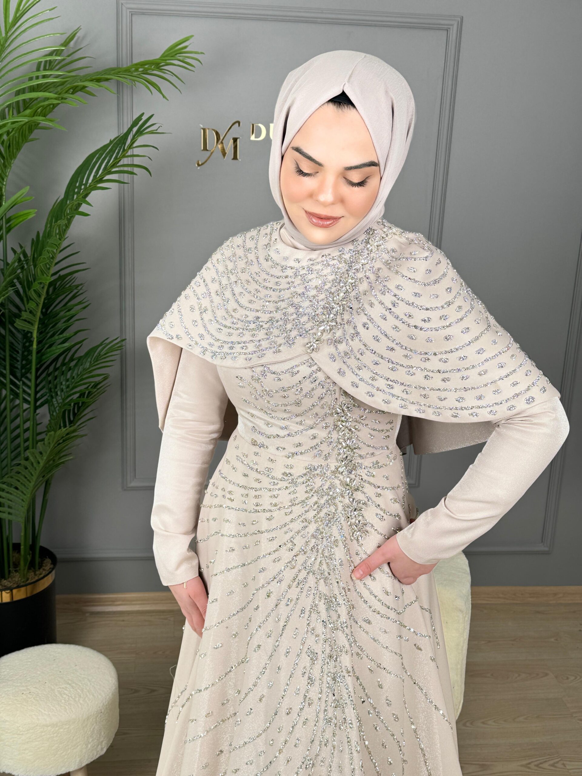 Feriha Sarıoğlu Pelerinli Taşlı Abiye Elbise-EFSANE