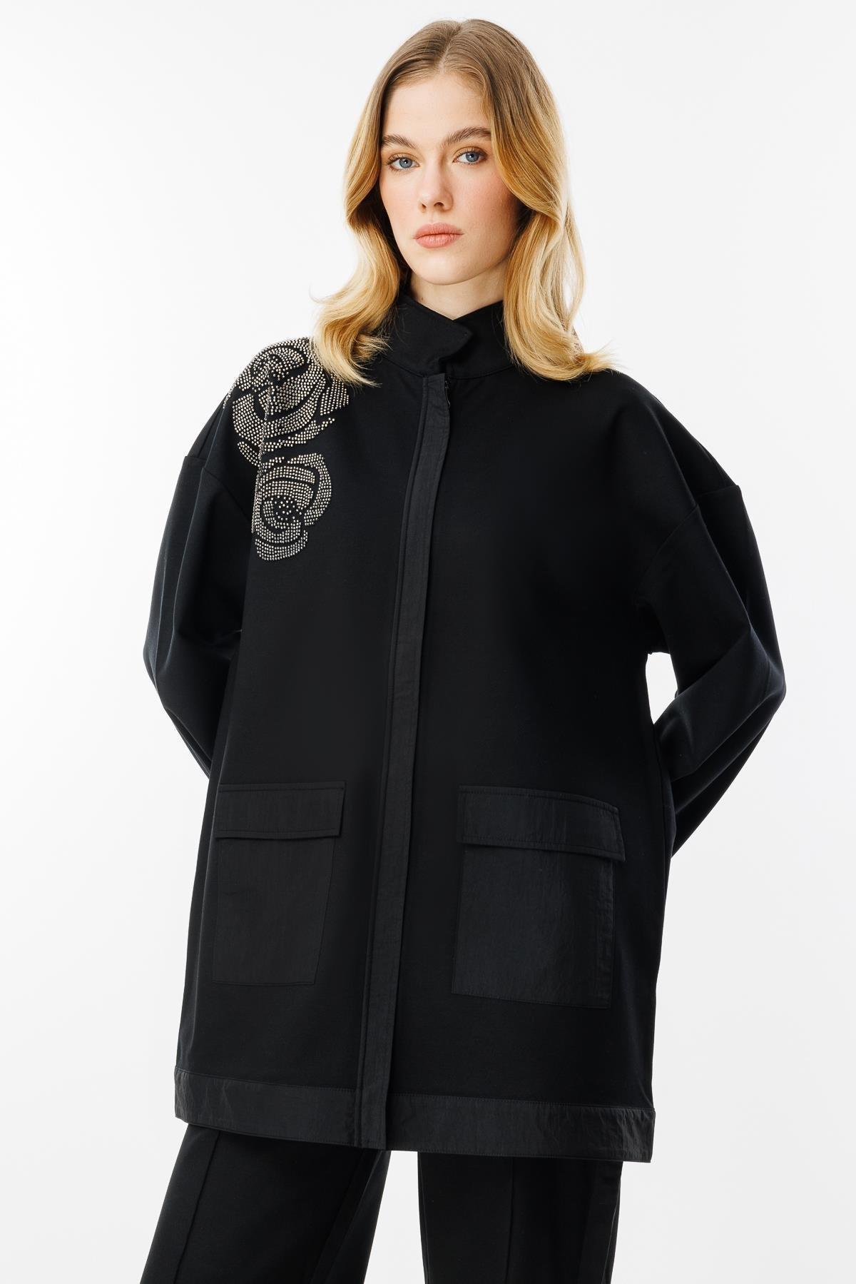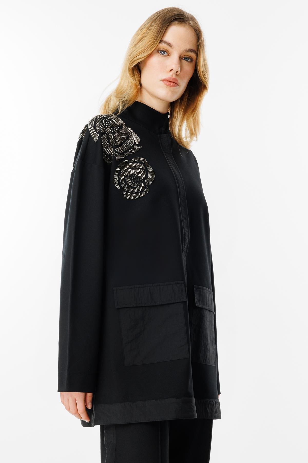 - Desen Triko Omzu ve Cebi Çiçek Detaylı Yün Hırka-23009