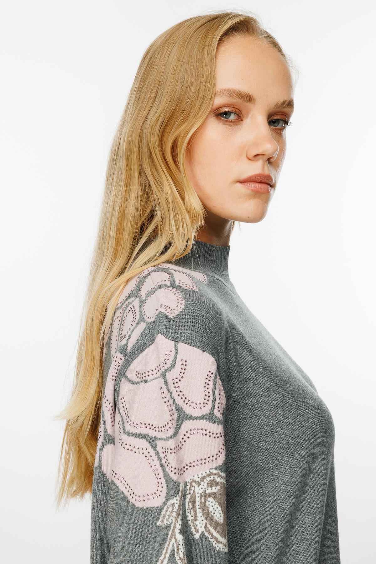 - Desen Triko Omzu ve Cebi Çiçek Detaylı Yün Hırka-23009