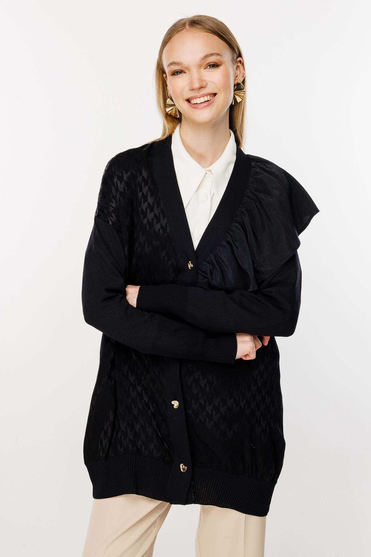 Fırfır detaylı, kol ve etek ucu ribanalı, düğme kapamalı hırka.-