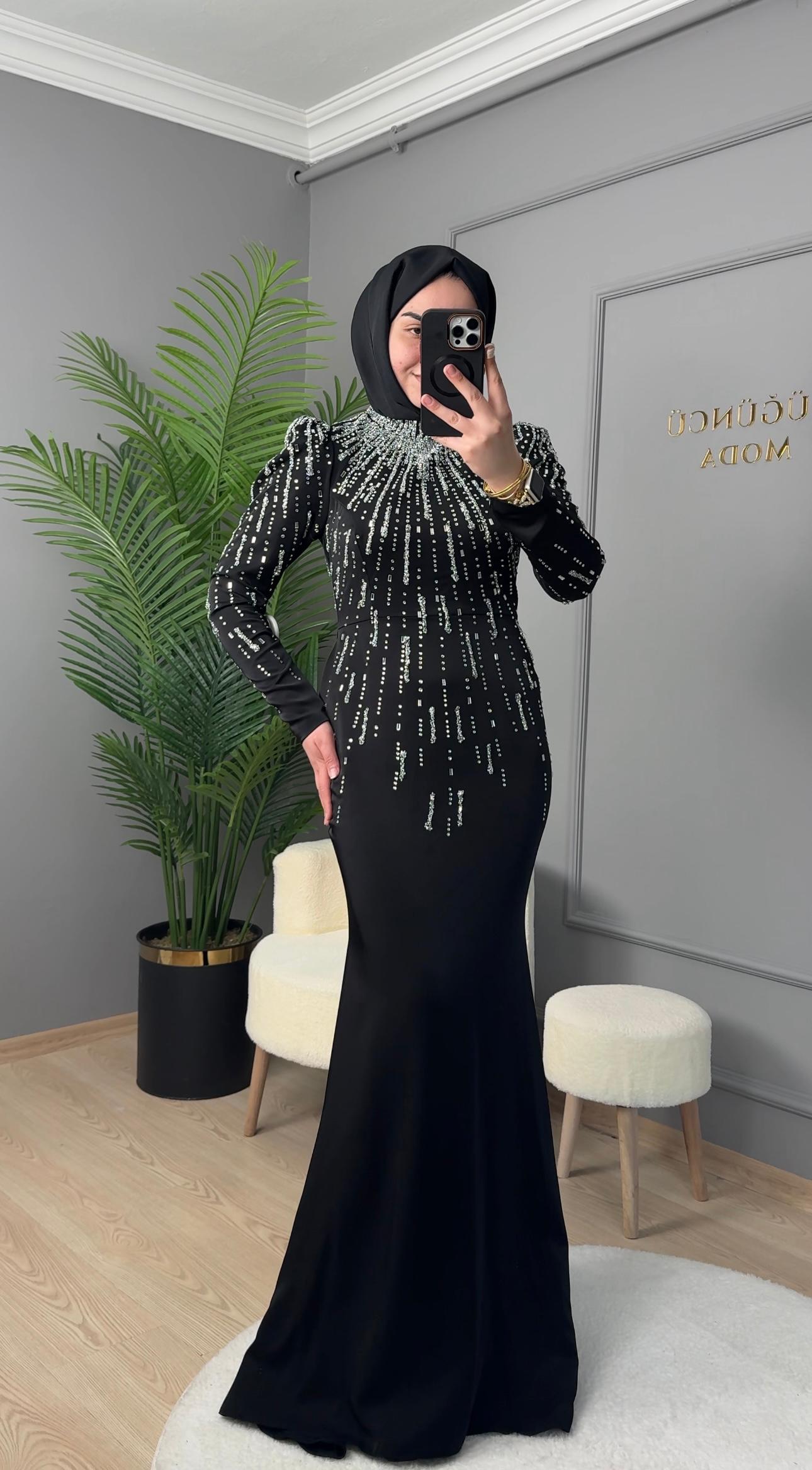Hennin Üstü Taş Detaylı Abiye Elbise-4968