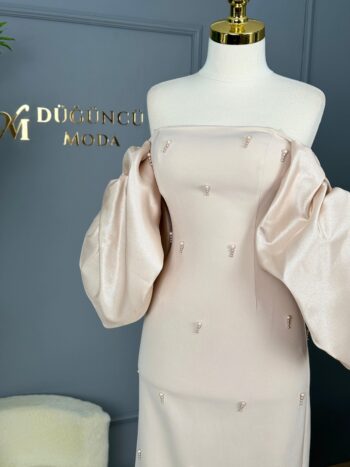 - Kenzel Kolları Taş Detaylı Saten Abiye Elbise-9066