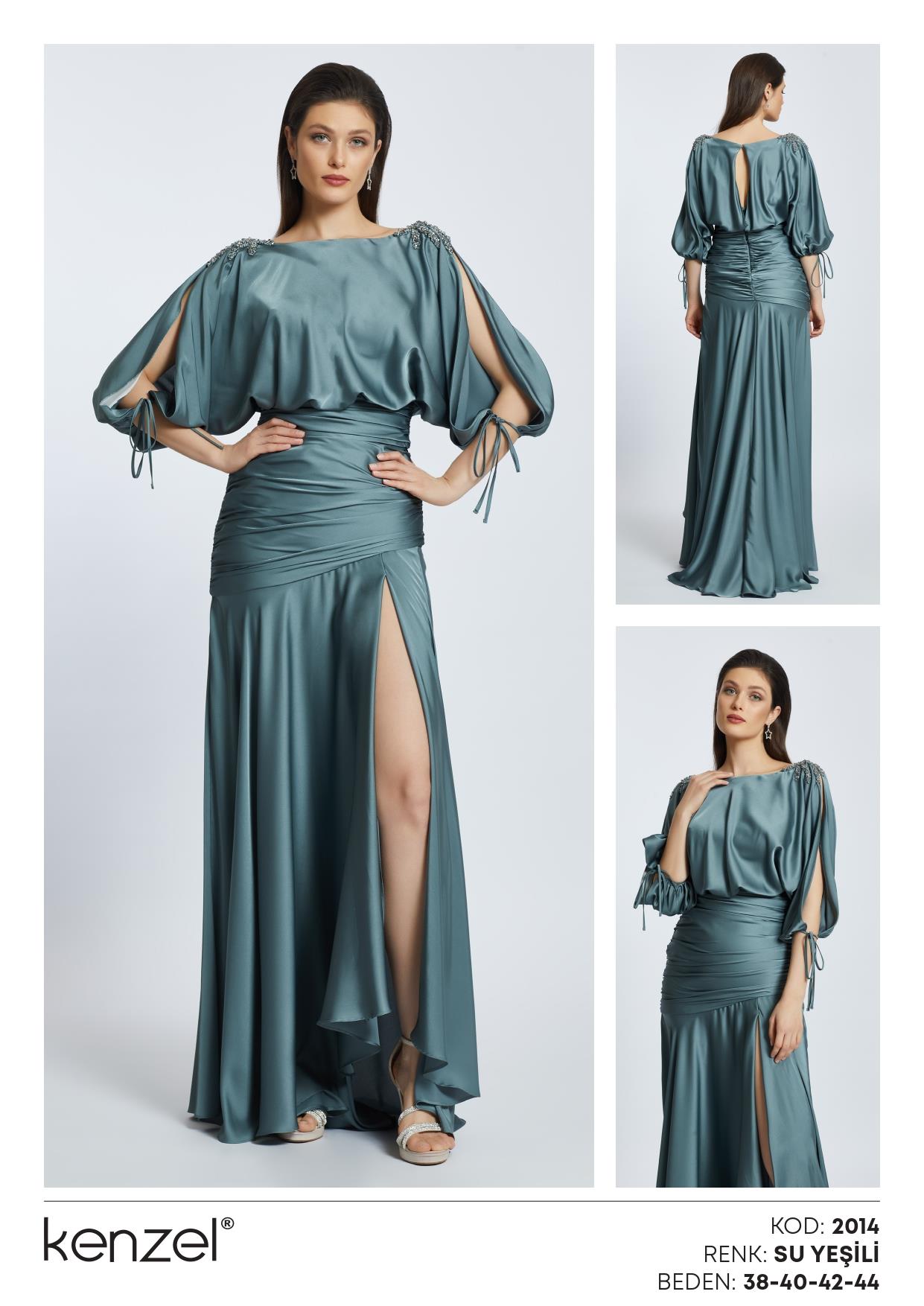 - Kenzel Kolları Taş Detaylı Saten Abiye Elbise-9066