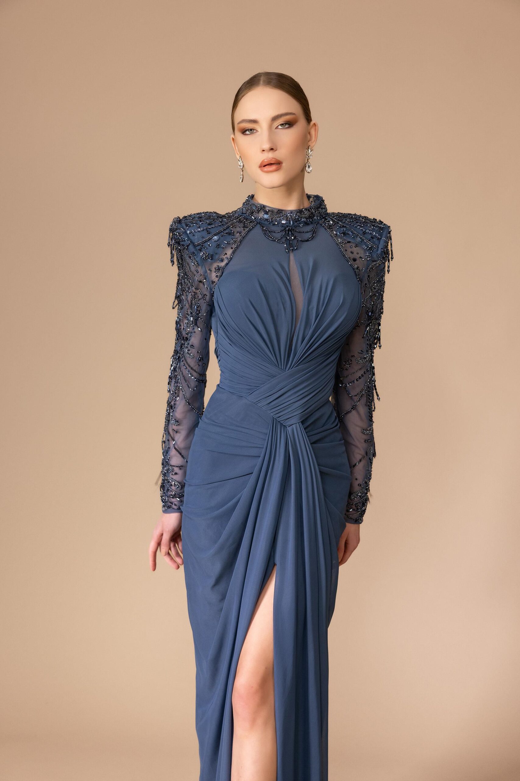 - Kenzel Kolları Taş Detaylı Saten Abiye Elbise-9066