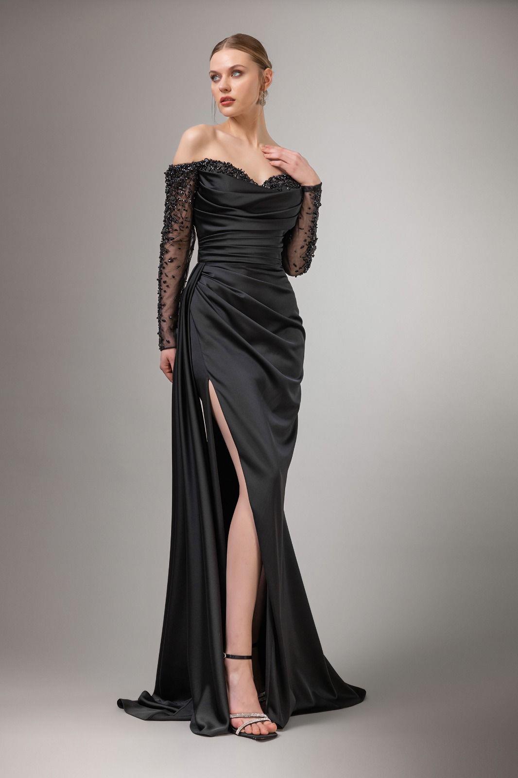- Kenzel Kolları Taş Detaylı Saten Abiye Elbise-9066