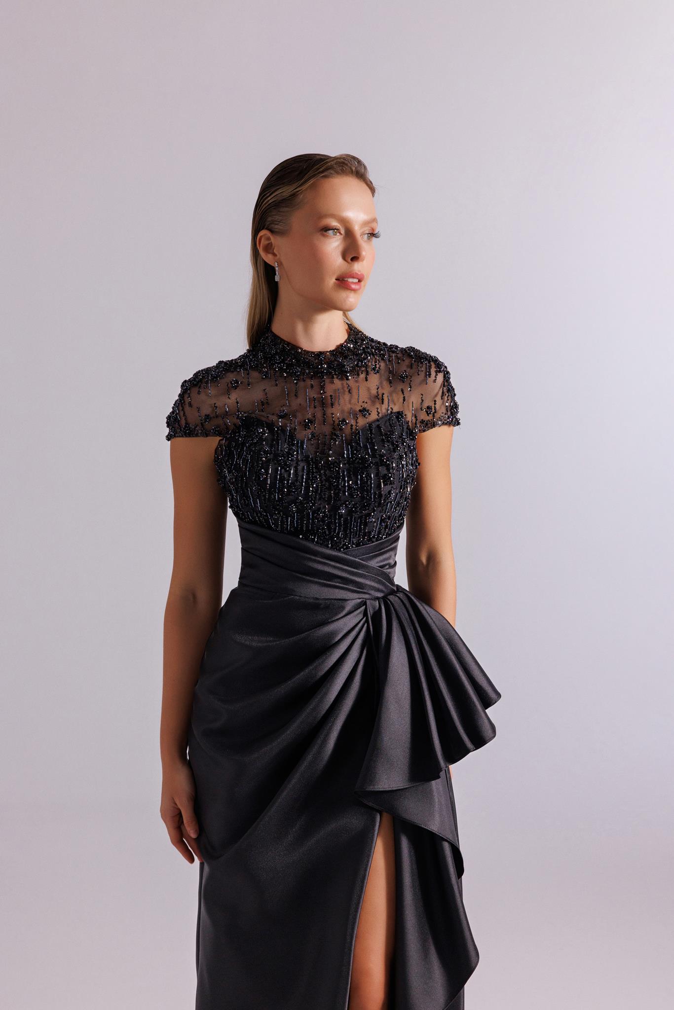 - Kenzel Üst Kısmı Taş Detaylı Abiye Elbise-9145