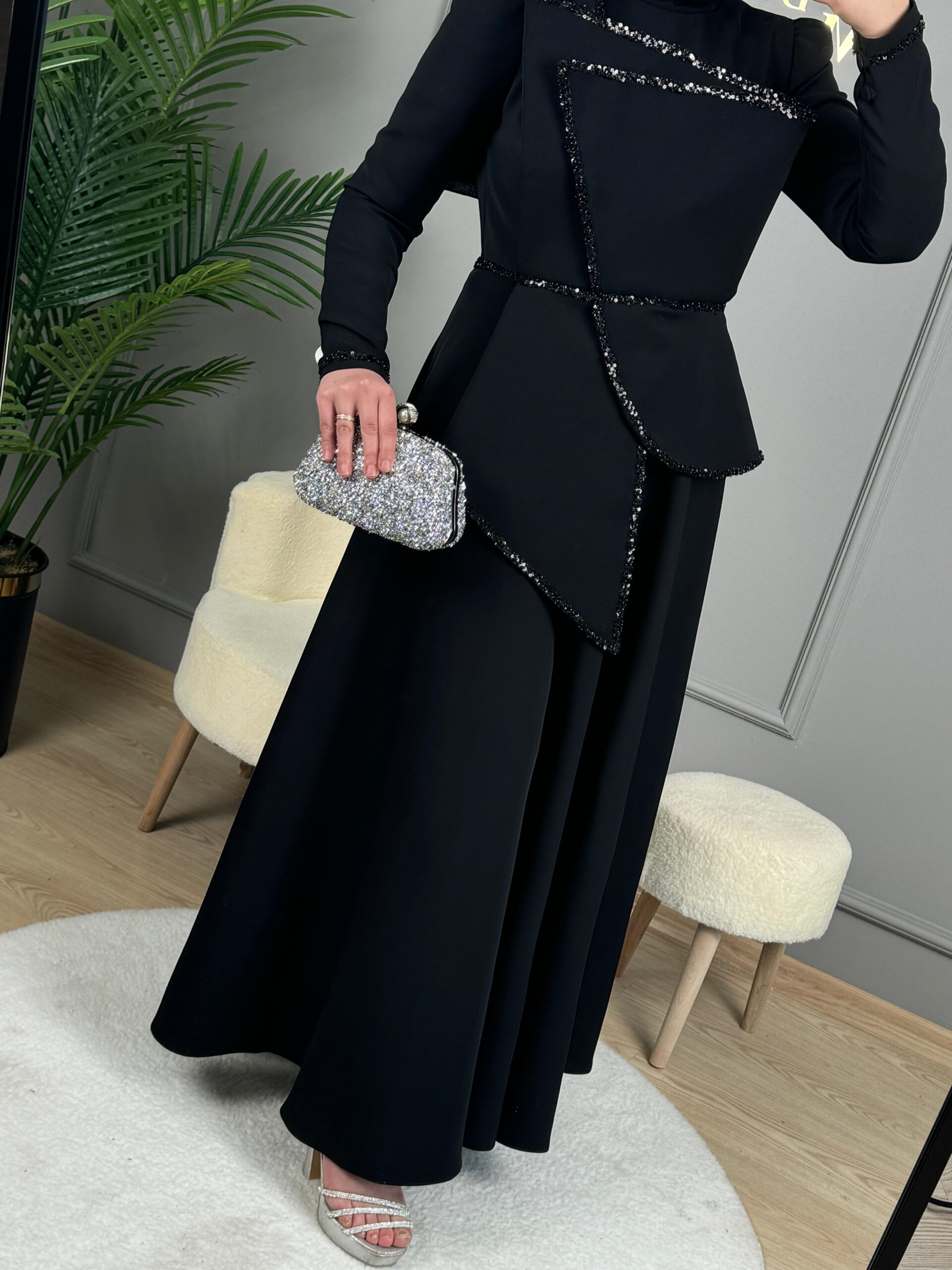 - Kenzel Üst Kısmı Taş Detaylı Abiye Elbise-9145