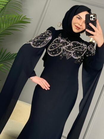 New Elegans Kolu Pelerin Detaylı Taşlı Abiye Elbise-2329-A