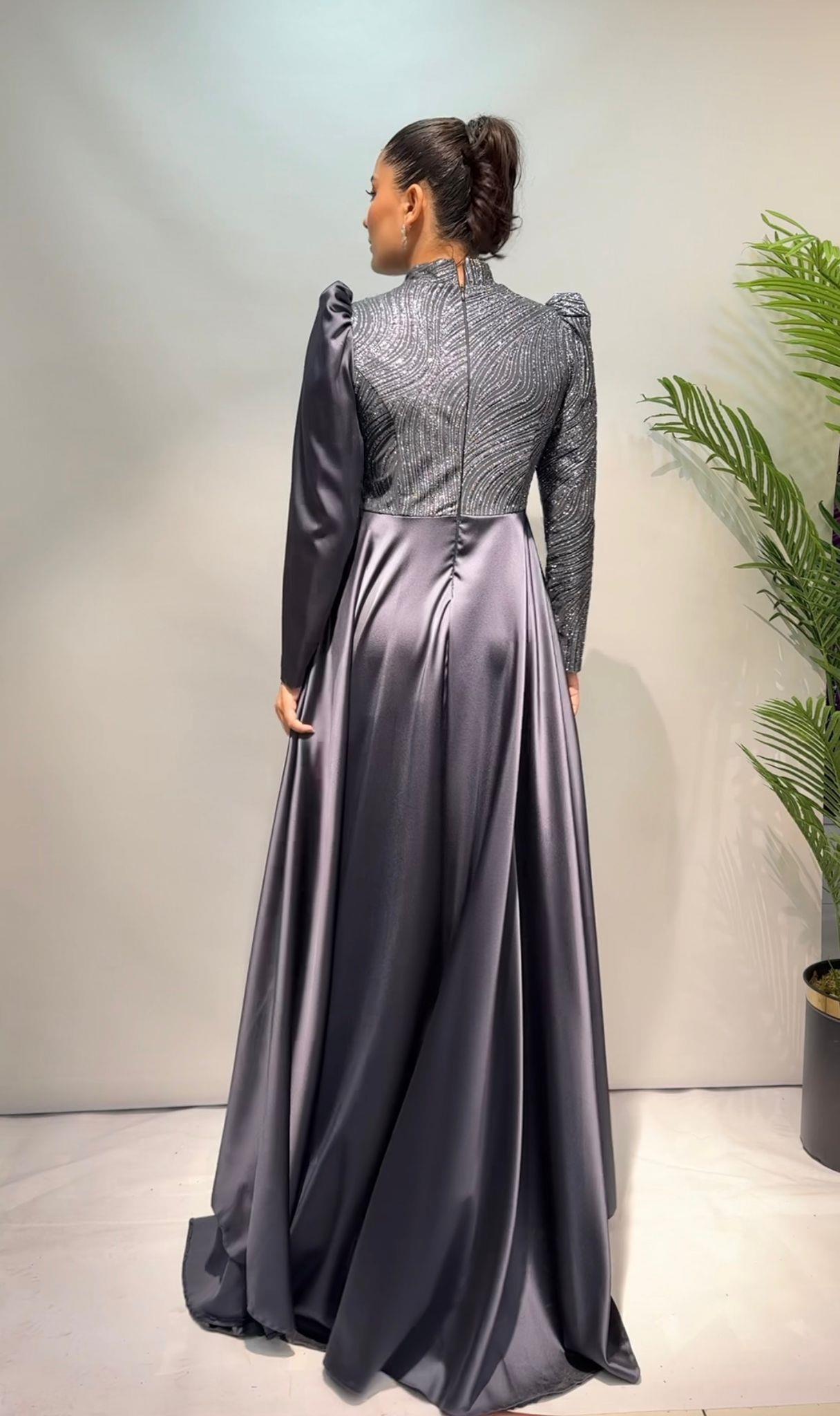 New Elegans Simli Detaylı Saten Abiye Elbise-2292 iade