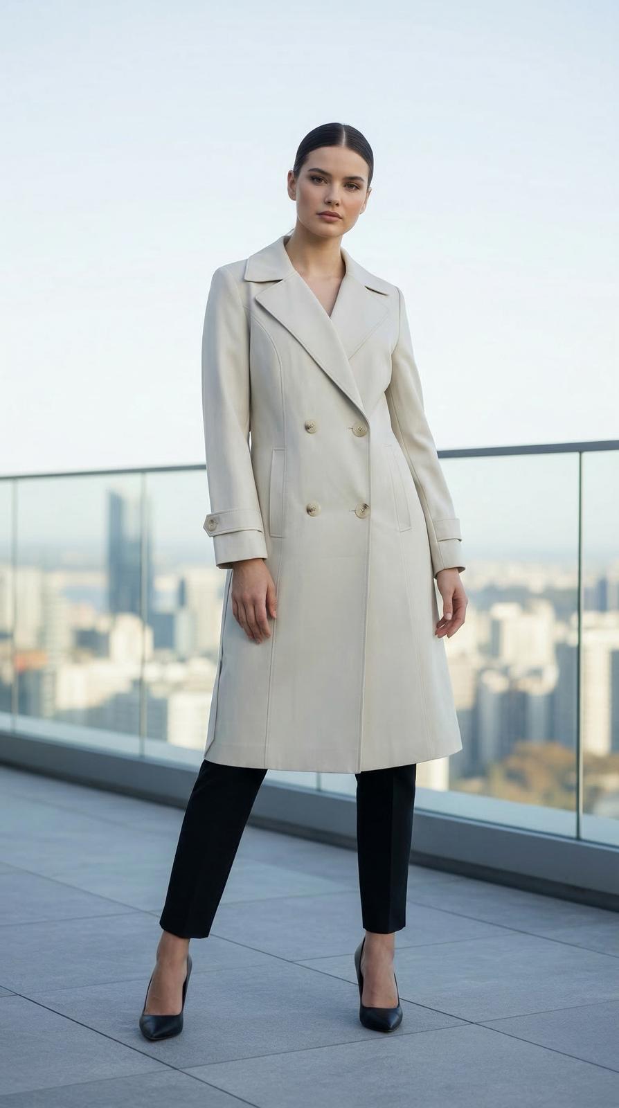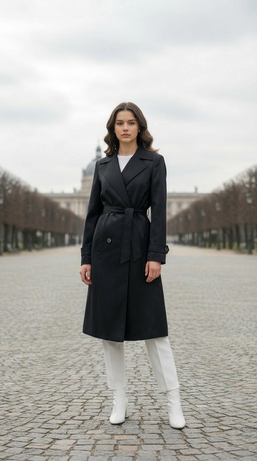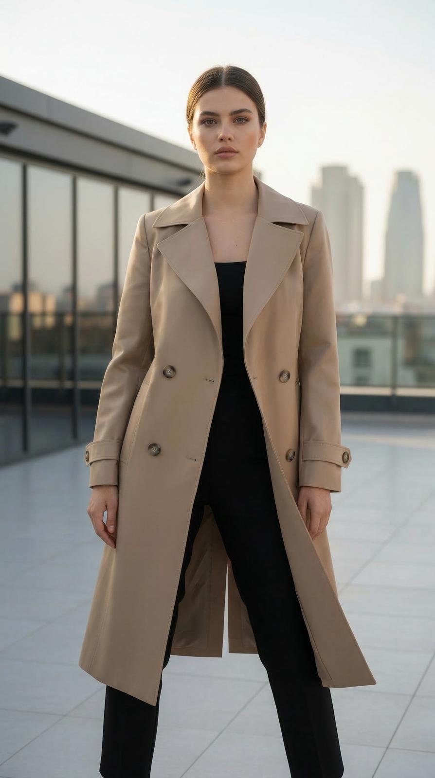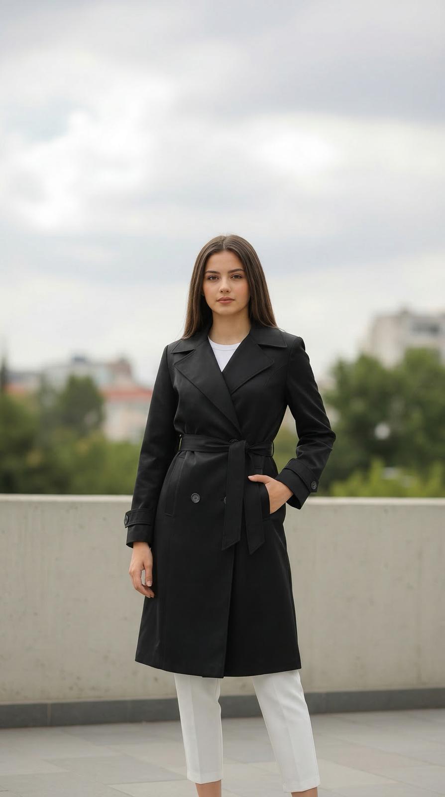 Gömlek yaka – Kuşaklı – Uzun kesim – Rahat kalıp – Astarlı