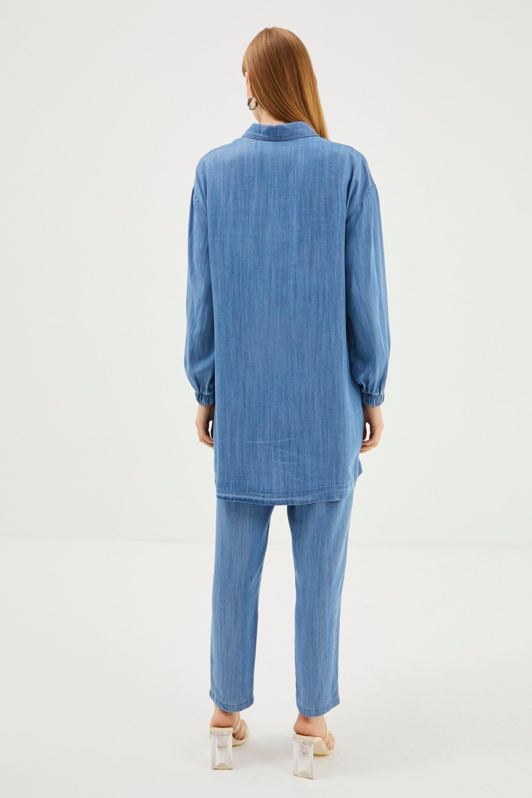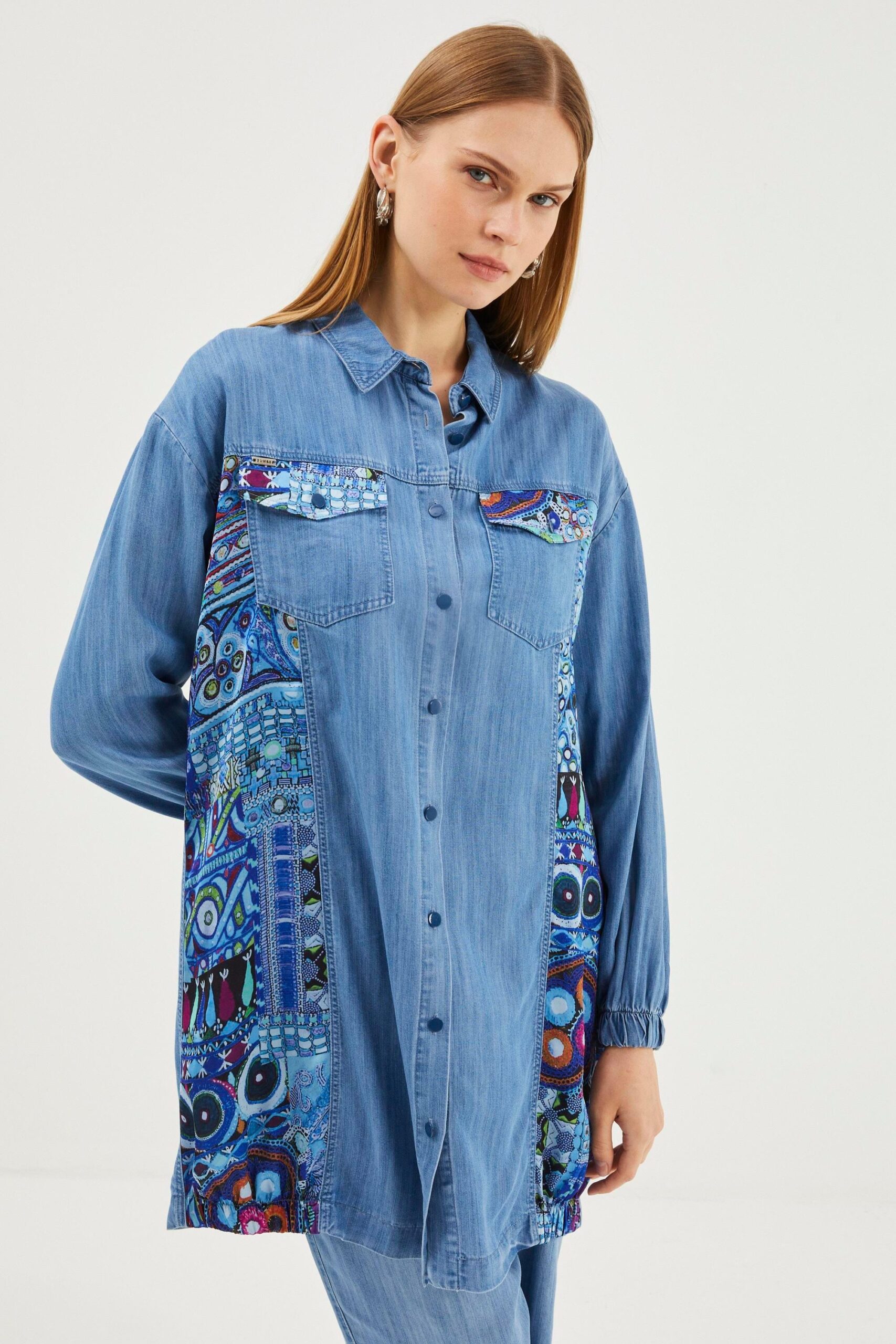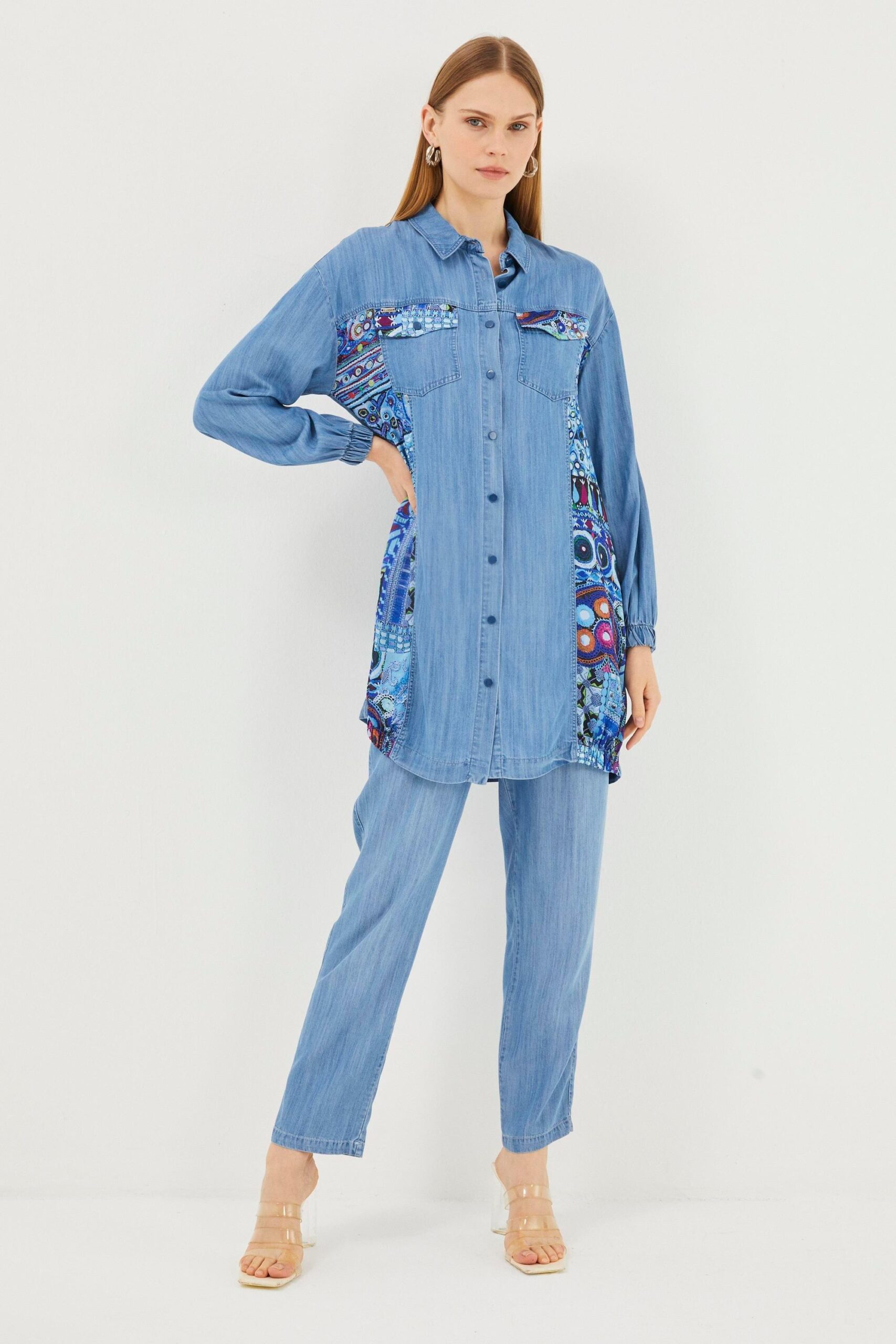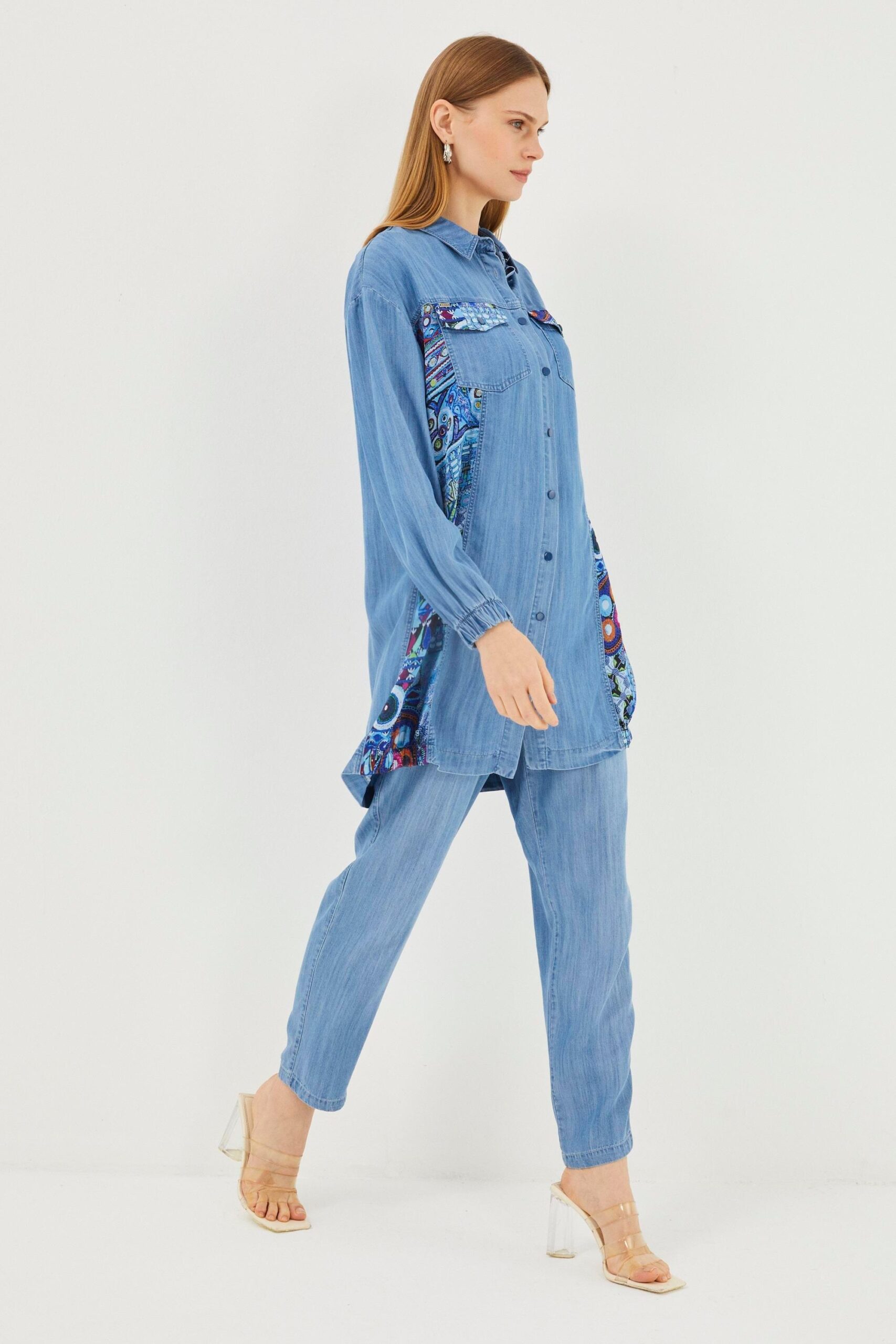 Zühre Desenli Gömlek Yaka Mavi Jean Tunik-1444