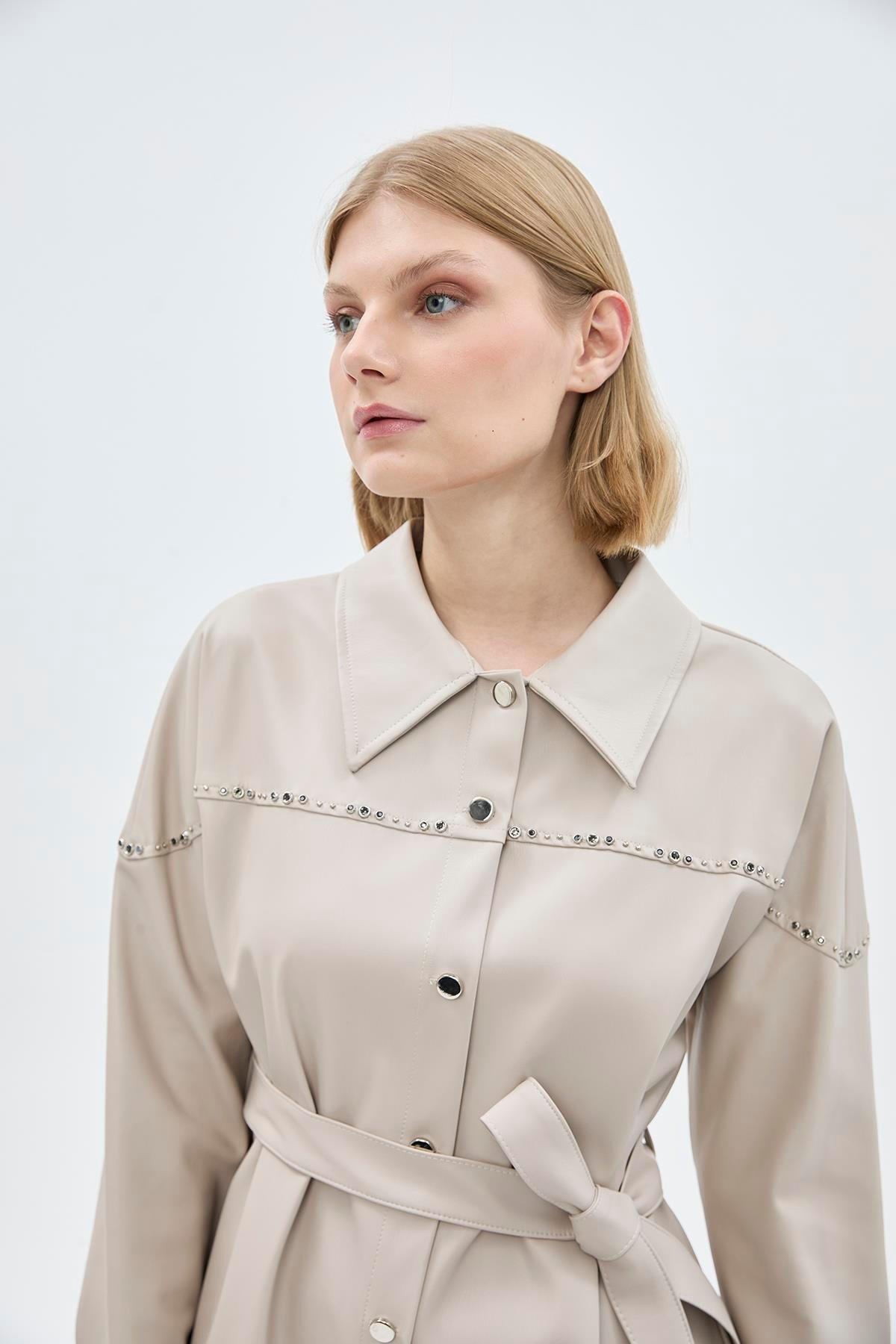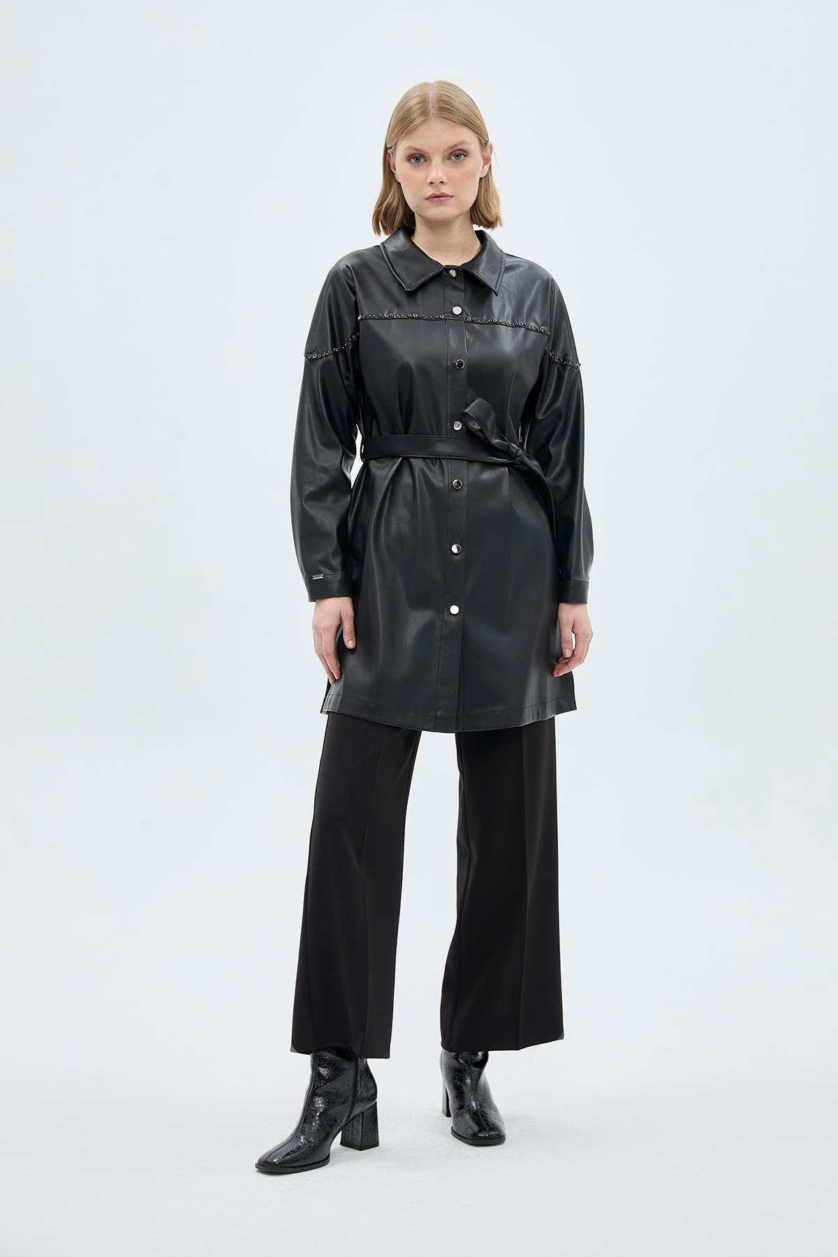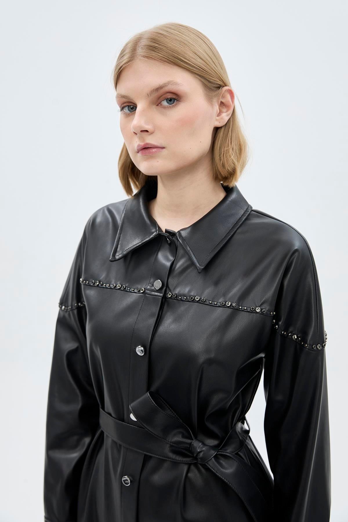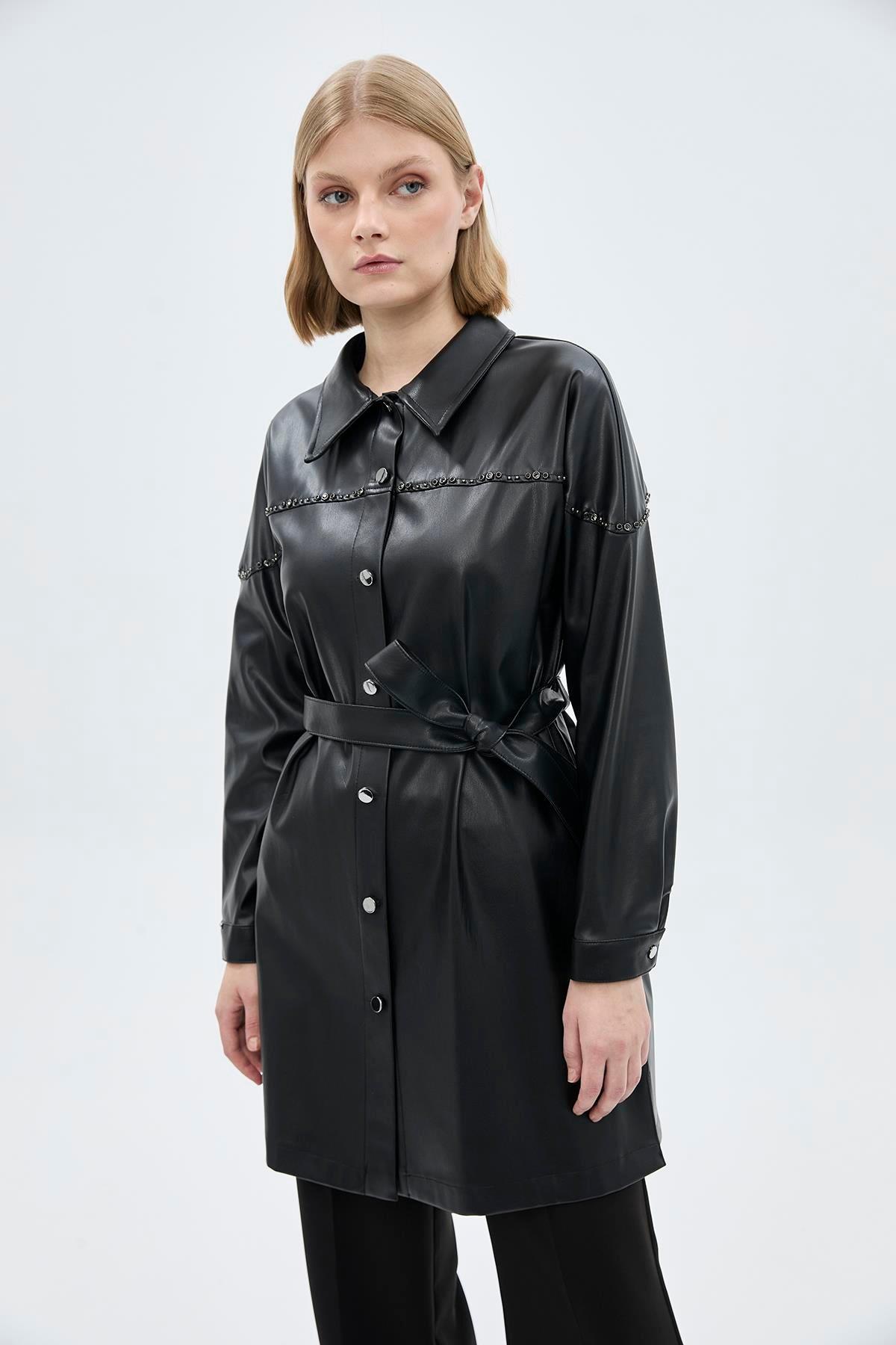 Zühre Yaka Taş Detaylı Deri Tunik-1476